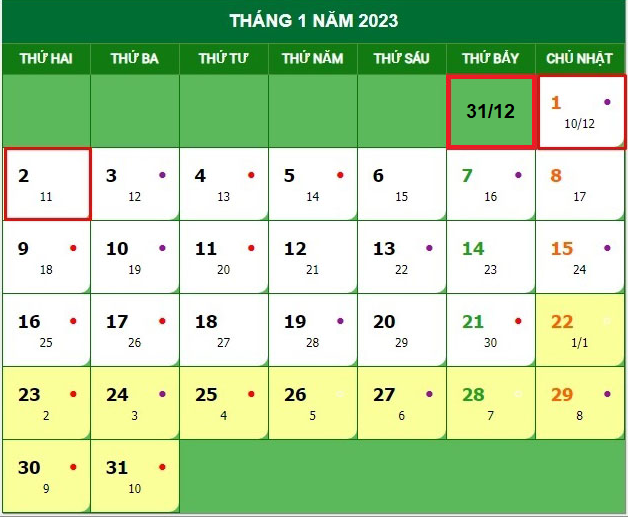 Người lao động làm việc theo chế độ nghỉ thứ Bảy, Chủ nhật, lịch nghỉ Tết Dương lịch 2023 sẽ kéo dài 3 ngày liên tục, từ 31/12/2022 đến hết ngày 2/1/2023.