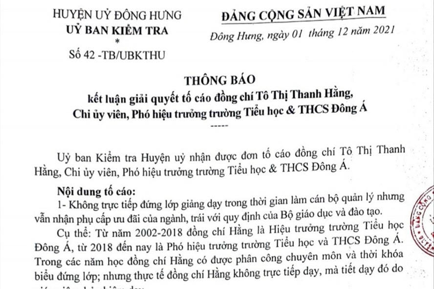 Trong Thông báo kết luận giải quyết tố cáo ngày 1/12/2021, Uỷ ban Kiểm tra Huyện ủy Đông Hưng kết luận: