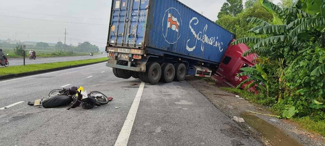 Hiện trường vụ tai nạn cho thấy xe máy của nhà sự bị hư hỏng nặng; xe container mất lái, lao sang vệ đường.