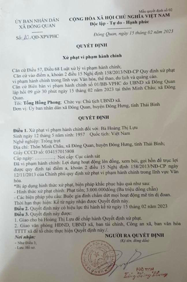 Chiều 17/2, thông tin với báo chí, ông Tống Hồng Phong, Chủ tịch UBND xã Đông Quan, huyện Đông Hưng (Thái Bình) cho biết trước đó 2 ngày, vào ngày 15/2, UBND xã này đã ra quyết định xử phạt vi phạm hành chính đối với bà Hoàng Thị Lựu (66 tuổi, trú thôn Minh Châu, cùng xã; thường được gọi là “Cô đồng Lựu”) về hành vi lợi dụng hoạt động lên đồng, xem bói, gọi hồn để trục lợi, quy định tại Điểm a, Khoản 2, Điều 15 Nghị định 158/2013/NĐ-CP của Chính phủ (quy định xử phạt vi phạm hành chính trong lĩnh vực văn hóa); yêu cầu chấm dứt mọi hoạt động mê tín dị đoan.