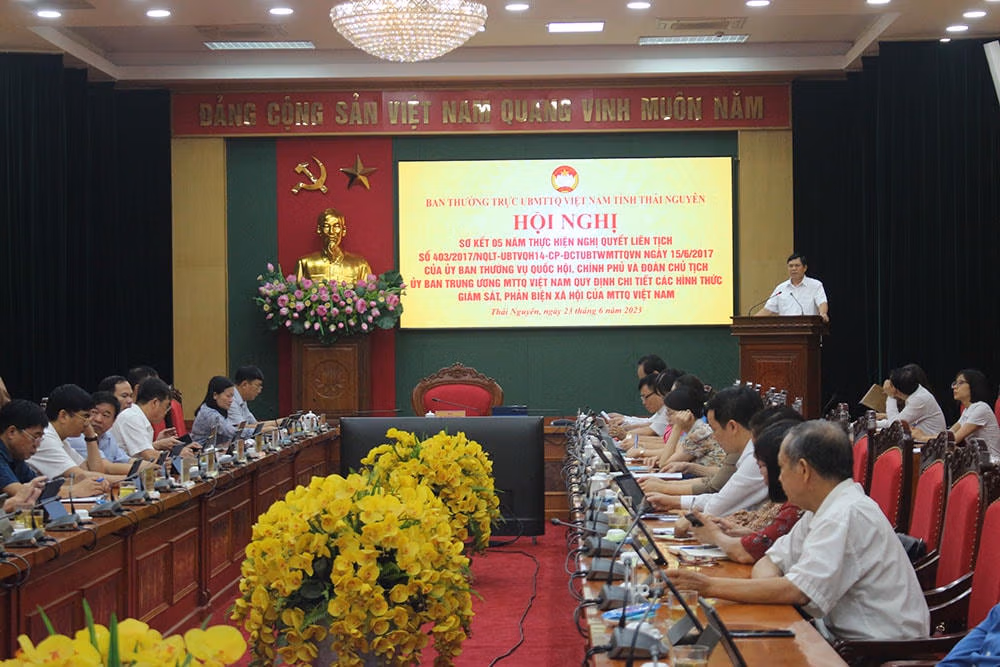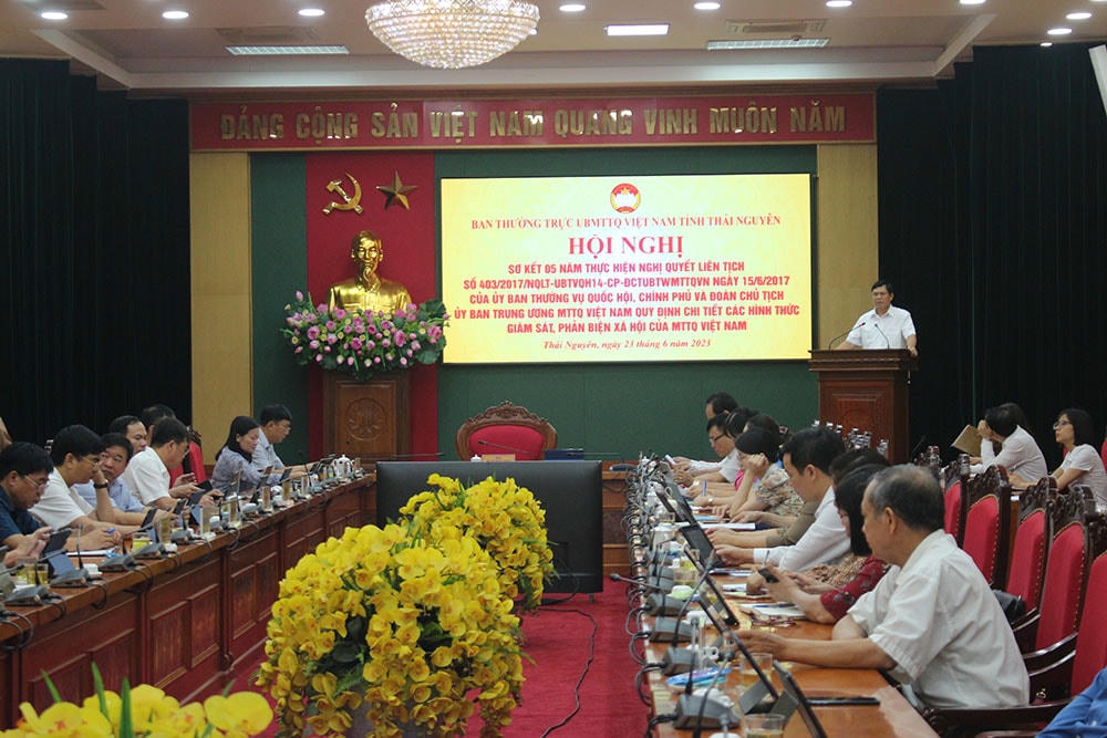 Sáng ngày 23/6, ông Phạm Thái Hanh, Chủ tịch Uỷ ban MTTQ tỉnh Thái Nguyên chủ trì Hội nghị Sơ kết 5 năm thực hiện Nghị quyết liên tịch số 403/2017/NQLT-UBTVQH14-CP-ĐCTUBTWMTTQVN ngày 15/6/2017 của Uỷ ban Thường vụ Quốc hội, Chính phủ và Đoàn Chủ tịch UBTƯ MTTQ Việt Nam quy định chi tiết các hình thức giám sát, phản biện xã hội của MTTQ Việt Nam (viết tắt là Nghị quyết liên tịch số 403).