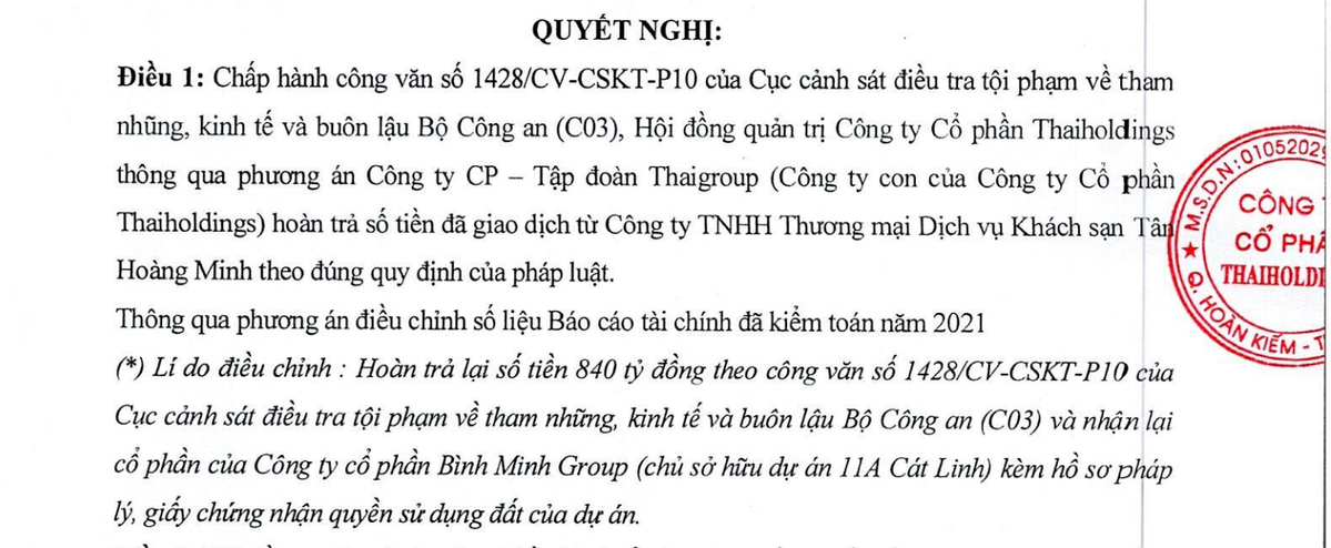 Theo đó, chấp hành công văn số 1428/CV-CSKT-P10 của Cục cảnh sát điều tra tội phạm về tham nhũng, kinh tế và buôn lậu Bộ Công an (C03), Thaiholdings thông qua phương án CTCP - Tập đoàn Thaigroup (Công ty con của Thaiholdings) hoàn trả số tiền 840 tỷ đồng đã giao dịch từ Công ty TNHH Thương mại dịch vụ Khách sạn Tân Hoàng Minh theo đúng quy định của pháp luật.