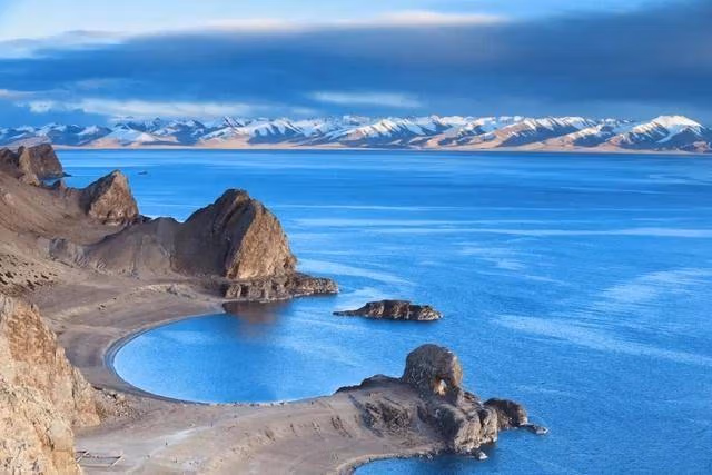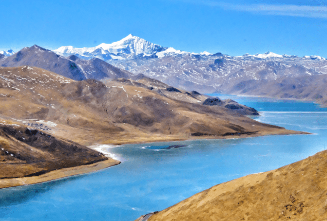 "Mảng màu" làm ngọc này che phủ 638 km vuông một vùng cao nguyên khô cằn, lạnh lẽo. Bên cạnh hồ là thiền viện Samding nổi tiếng (đây là thiền viện duy nhất có sư trụ trì là nữ).