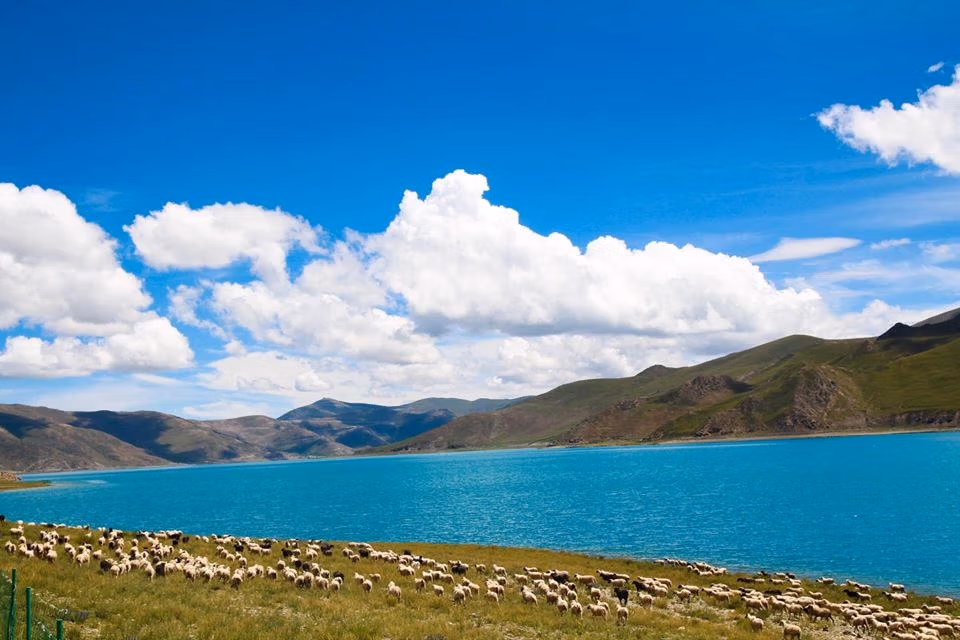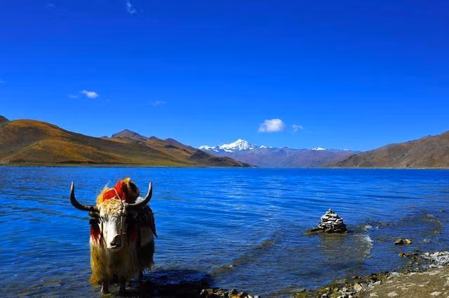 Hồ Yamdrok giống như một xứ sở thần tiên, bầu trời xanh ngắt tương phản với nước hồ, cỏ cây thấp chen nhau đôi bờ. Thỉnh thoảng, có mấy con bò yak và cừu đi qua đi lại.