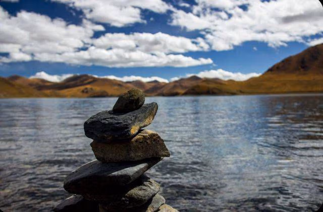 Xung quanh hồ là con đường uốn khúc mềm mại tựa như một chiếc khăn. Bên hồ là những đống đá nhỏ mà người mộ đạo xếp khi đi hành hương đến đây.
