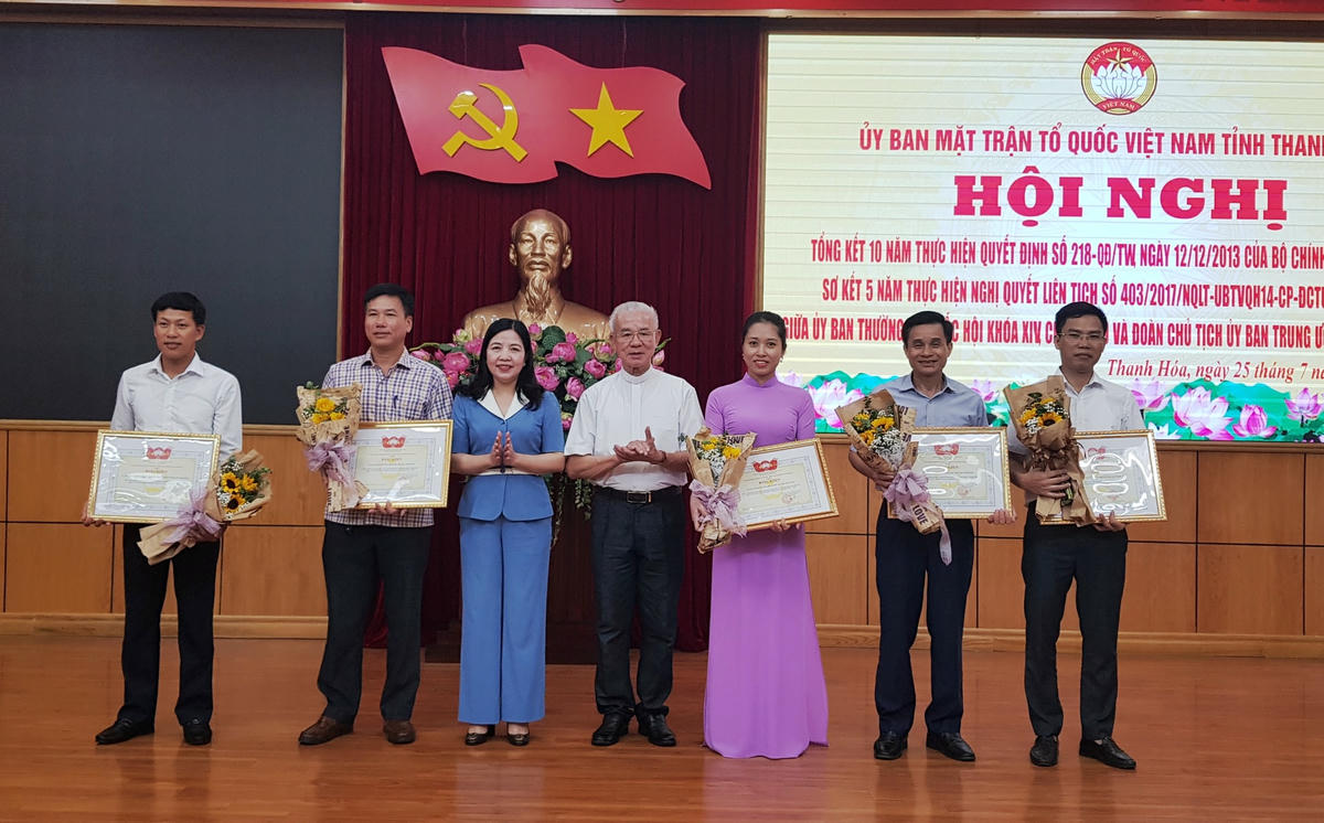 Cũng tại hội nghị, bà Phạm Thị Thanh Thủy cùng các lãnh đạo tỉnh Thanh Hóa đã trao bằng khen cho 6 tập thể có thành tích xuất sắc trong triển khai thực hiện Quyết định số 218-QĐ/TW ngày 12/12/2013, của Bộ Chính trị khóa XI, giai đoạn 2013-2023; 32 tập thể có thành tích xuất sắc trong triển khai thực hiện Nghị quyết liên tịch số 403/2017 giữa Ủy ban Thường vụ Quốc hội khóa XIV, Chính phủ và Đoàn Chủ tịch Ủy ban MTTQ Trung ương MTTQ Việt Nam, giai đoạn 2017-2022.