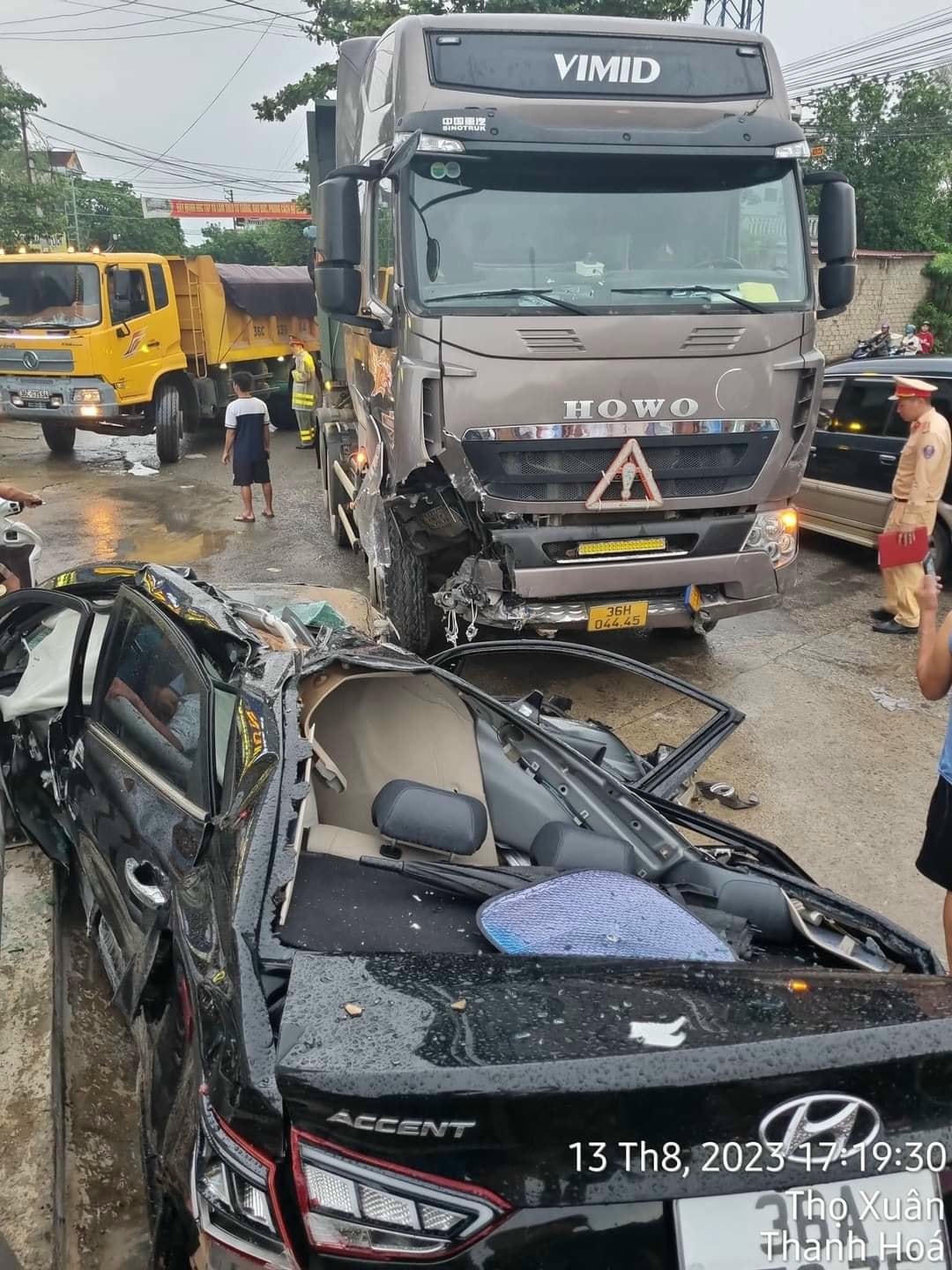 Khi đi đến ngã 4 xã Xuân Lai (huyện Thọ Xuân), xe đầu kéo biển số Thanh Hóa bất ngờ tông trực diện vào xe ô tô con khiến 3 người trong xe bị mắc kẹt, may mắn được người dân ứng cứu và đưa đi bệnh viện.
