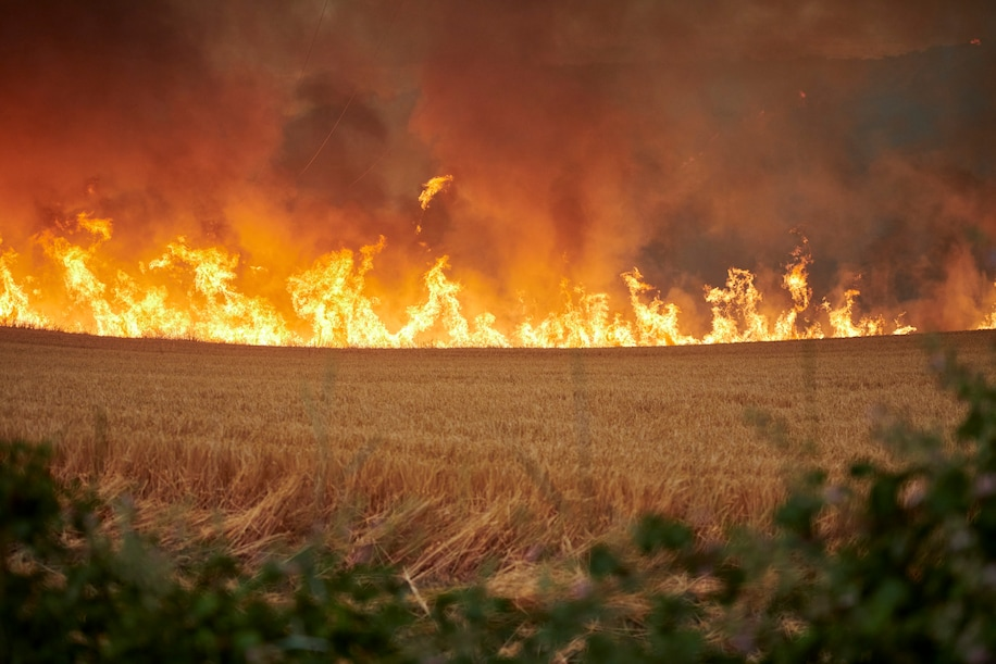 Ngọn lửa bốc cháy dữ dội trên một cánh đồng ở Arraiza, miền Bắc Tây Ban Nha, hôm 18/6. Ngọn lửa bốc cháy dữ dội trên một cánh đồng ở Arraiza, miền bắc Tây Ban Nha, hôm thứ 7 tuần trước. Do hạn hán, một thành phố cổ có tuổi đời 3.400 năm cũng lộ ra sau khi mức nước ở một hồ chứa sụt giảm nghiêm trọng.