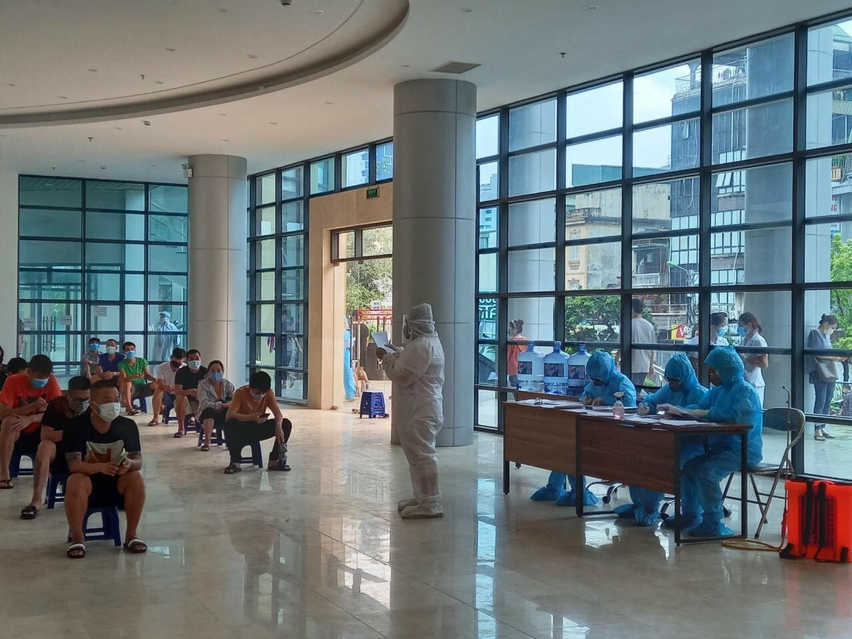 Trong sảnh lớn của tòa nhà, các khu vực được nhân viên y tế chủ động phân chia, nơi lấy mẫu xét nghiệm, nơi khai báo thông tin và khu vực xếp hàng, đảm bảo giãn cách đúng quy định. Ba nhân viên y tế phụ trách việc hướng dẫn, sắp xếp người dân vào khu vực chờ liên tục đi lại, hướng dẫn cụ thể từng người dân.