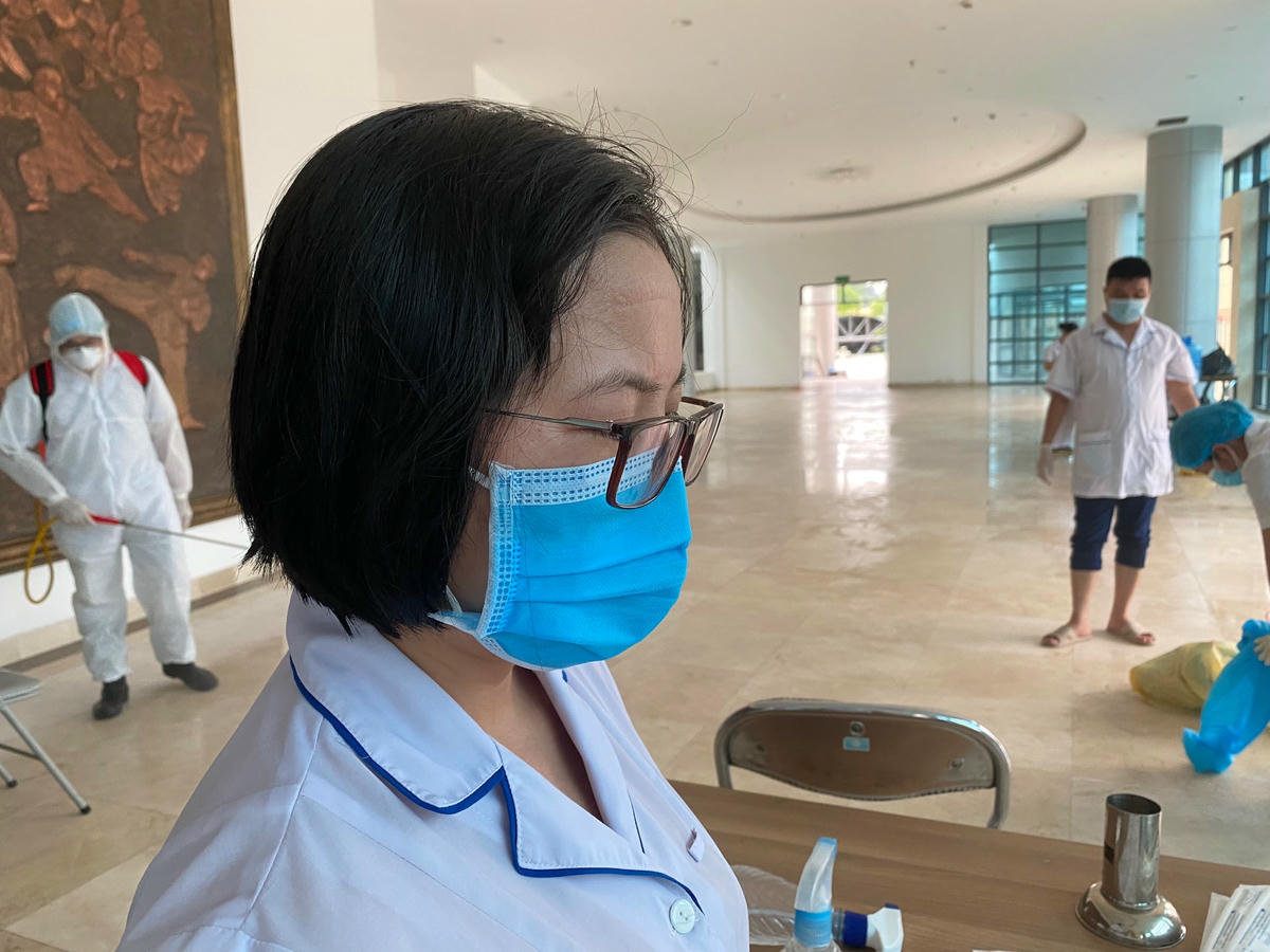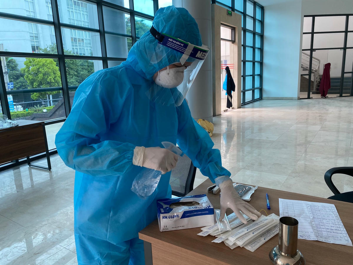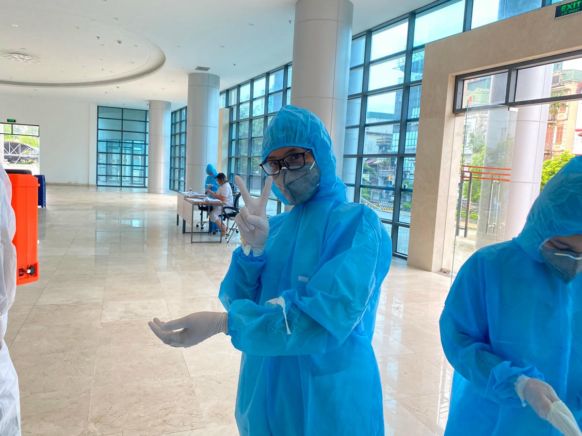 Tới mỗi nhà F1, chị Nam mặc đồ bảo hộ theo đúng từng bước, có 1 nhân viên y tế trong quận đi cùng hỗ trợ. Sau khi mặc bảo hộ, chị Nam tiến vào từng nhà và thực hiện công việc của mình. Sau khi cất mẫu, ra khỏi nhà F1, chị Nam lại thực hiện từng bước khử khuẩn và cởi đồ bảo hộ. Công việc tưởng chừng đơn giản nhưng khá vất vả bởi riêng thời gian cởi và mặc bảo hộ đã chiếm khá nhiều.