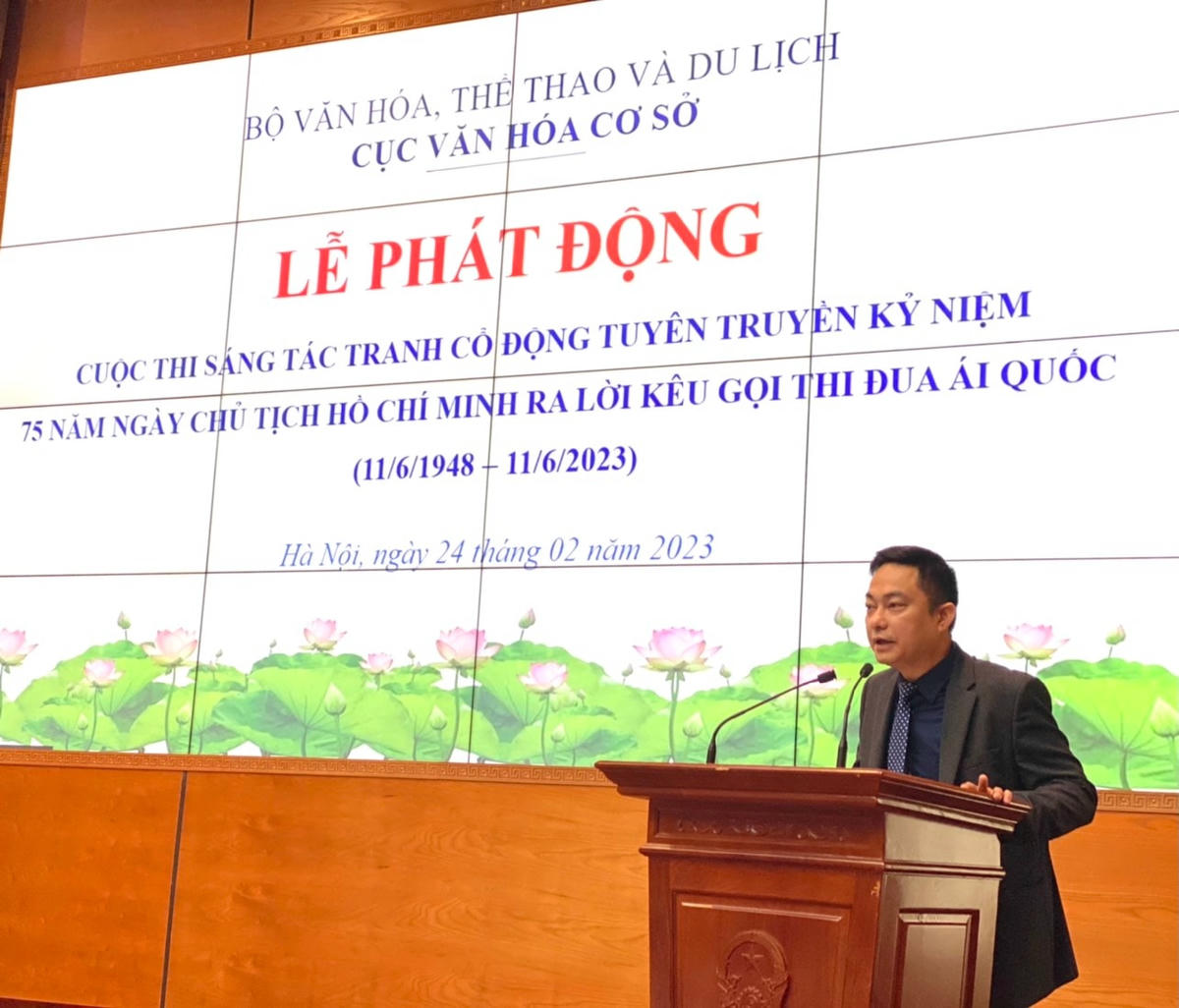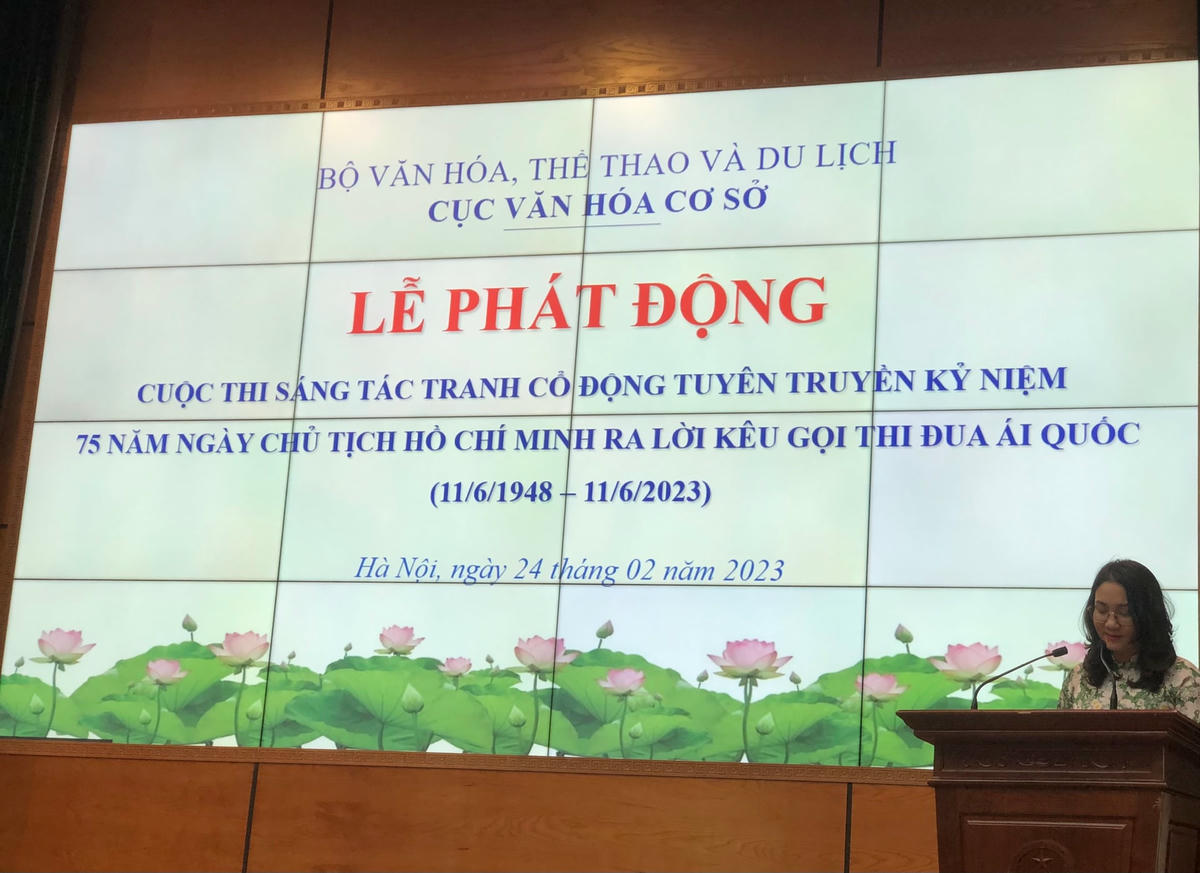 Sáng 24/2, tại Hà Nội, Cục Văn hóa Cơ sở, Bộ Văn hóa, Thể thao và Du lịch tổ chức Lễ phát động Cuộc thi sáng tác tranh cổ động tuyên truyền kỷ niệm 75 năm Ngày Chủ tịch Hồ Chí Minh ra Lời kêu gọi thi đua ái quốc (11/6/1948 - 11/6/2023).