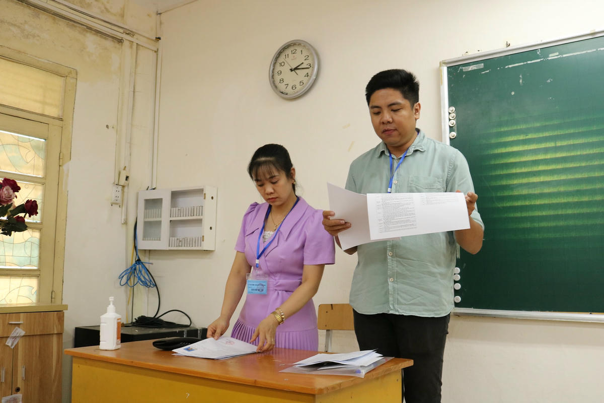 Tại điểm thi Trường THPT Việt Đức (Hà Nội) các thí sinh đến làm thủ tục dự thi khá sớm trước khoảng 1 tiếng. Hồi hộp, lo lắng là tâm trạng chung của hầu hết thí sinh.Dù đã chuẩn bị rất tốt nhưng em Phan Đức Mạnh, học sinh lớp 12A4 Trường THPT Trần Phú – Hoàn Kiếm vẫn khá lo lắng. Cả đêm qua Mạnh mất ngủ, hồi hộp chờ tới ngày dự thi hôm nay. Trước khi tới điểm thi, Mạnh vẫn tranh thủ thời gian buổi sáng để ôn tập. Mạnh cho biết, em đã trúng tuyển 2 trường đại học bằng phương thức xét tuyển học bạ. Tuy nhiên, nguyện vọng 1 của em là đỗ vào Trường Đại học Kinh tế quốc dân thế nên Mạnh quyết tâm phải hoàn thành, đạt kết quả tốt tại kỳ thi này.Tại điểm thi Trường THPT Việt Đức có 17 phòng thi, bà Trần Thị Quỳnh Hoa – Phó hiệu trưởng nhà trường, Phó trưởng điểm phụ trách điểm thi Trường THPT Việt Đức cho hay, mọi công tác chuẩn bị của điểm thi đã được thực hiện chu đáo, đảm bảo các điều kiện tốt nhất cho thí sinh.Đặc biệt, năm nay, điểm thi có nhiều phương án bảo đảm nghiêm ngặt, chặt chẽ phòng chống gian lận thi cử bằng các thiết bị công nghệ tinh vi.Ngày mai, (28/7), thí sinh sẽ bước vào ngày thi đầu tiên với hai môn Ngữ văn và Toán. Bà Trần Thị Quỳnh Hoa nhắn nhủ, thí sinh hãy chuẩn bị sức khỏe tốt nhất, bình tĩnh, tự tin, tập trung làm bài thi hết khả năng để đạt kết quả tốt nhất.Cán bộ coi thi kiểm tra thông tin thí sinh.Tại các phòng thi, cán bộ coi thi nhắc nhở thời gian gọi thí sinh, thời gian làm bài, những vật dụng thí sinh không được phép mang vào phòng thi, xử lý những sai sót (nếu có) của thí sinh.Năm nay, cả nước có hơn 1 triệu thí sinh đăng ký thi tốt nghiệp THPT, nhiều hơn năm 2022 khoảng 24.000 em.Trong đó, hơn 917.000 thí sinh dùng kết quả thi để vừa xét tốt nghiệp, vừa xét đại học. Số thí sinh thi chỉ để xét tốt nghiệp THPT là 73.200. Số thí sinh thi để xét tuyển vào đại học là hơn 34.200 thí sinh.Theo Bộ GDĐT, năm nay việc tổ chức kỳ thi cơ bản được giữ ổn định như năm 2022. Các tỉnh thành chủ trì toàn bộ công tác tổ chức thi tại địa phương.