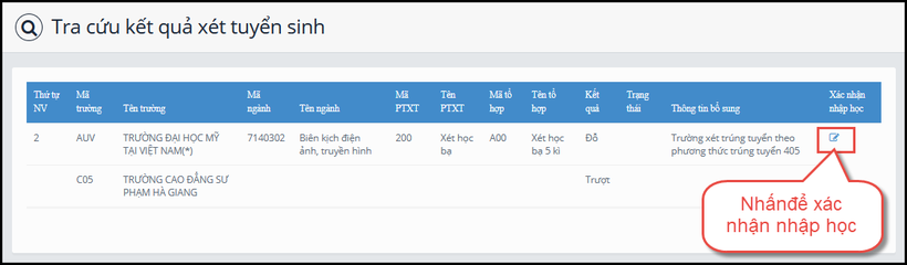 Đối với nguyện vọng đỗ thí sinh có quyền xác nhận nhập học. Để xác nhận nhập học thí sinh nhấn nút Xác nhận nhập học như hình dưới.