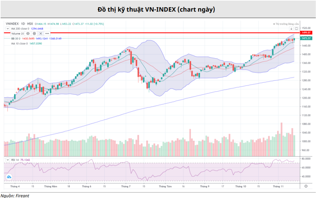 SSI cho rằng, diễn biến phiên cuối tuần qua (12/11) cho thấy rủi ro điều chỉnh ngắn hạn đã nhẹ bớt. Tuy vậy, NĐT cần thận trọng khi chỉ số đang tiệm cận vùng kháng cự 1.475 điểm và khả năng cung sẽ gia tăng từ vùng này. Vùng 1.450 – 1.425 điểm là vùng hỗ trợ gần nhất của chỉ số, NĐT có thể tận dụng các nhịp điều chỉnh ngắn hạn khi chỉ số lùi về gần vùng này để tích lũy cổ phiếu.