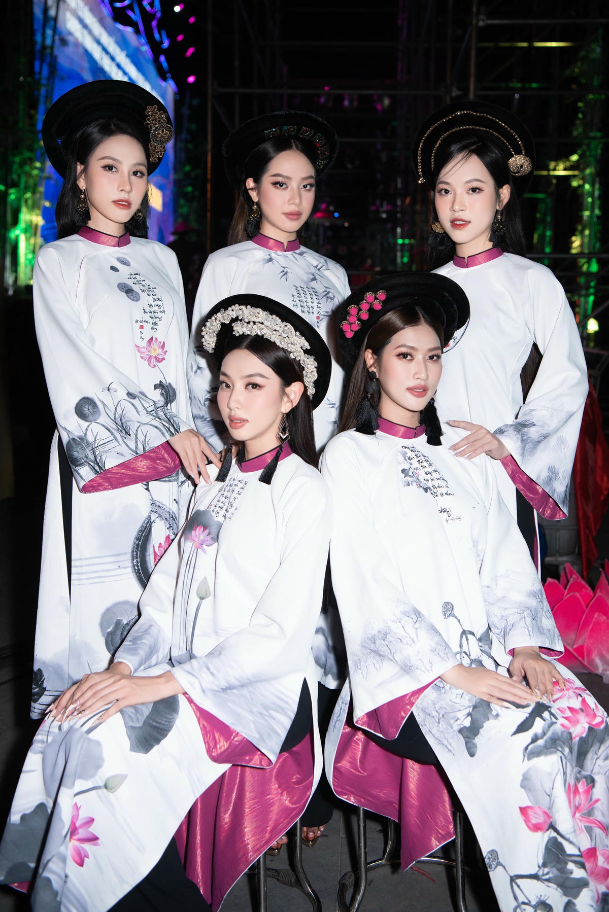 Ngoài Thiên Ân, sự kiện còn có sự tham gia của Thùy Tiên, Thanh Thủy, Ngọc Hằng... Các người đẹp mặc trang phục trong bộ sưu tập Thơ đề áo lụa của nhà thiết kế Việt Hùng.