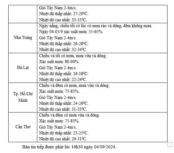 Khu vực Tây Nguyên và Nam Bộ có mưa, mưa vừa và rải rác có dông, cục bộ có nơi mưa to đến rất to (mưa tập trung vào chiều và tối).
