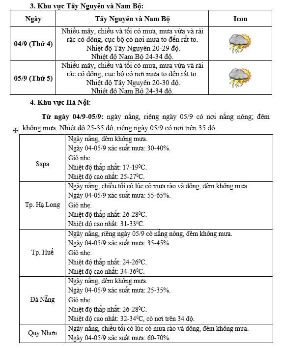 Trung tâm dự báo khí tượng thủy văn Quốc gia dự báo thời tiết dịp lễ khai giảng năm học 2024-2025 từ ngày 4 đến ngày 5/9/2024.