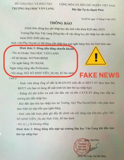 Thông tin từ phía Trường ĐH Văn Lang, một số phụ huynh và thí sinh báo tin về trường cho biết nhận được thông báo về việc đóng học phí nhập học của tân sinh viên khóa 28, yêu cầu thí sinh chuyển khoản học phí. Theo thông báo giả mạo này, tên số tài khoản là ĐH Văn Lang, yêu cầu tân sinh viên đóng học phí với tổng số tiền hơn 86,6 triệu đồng.
