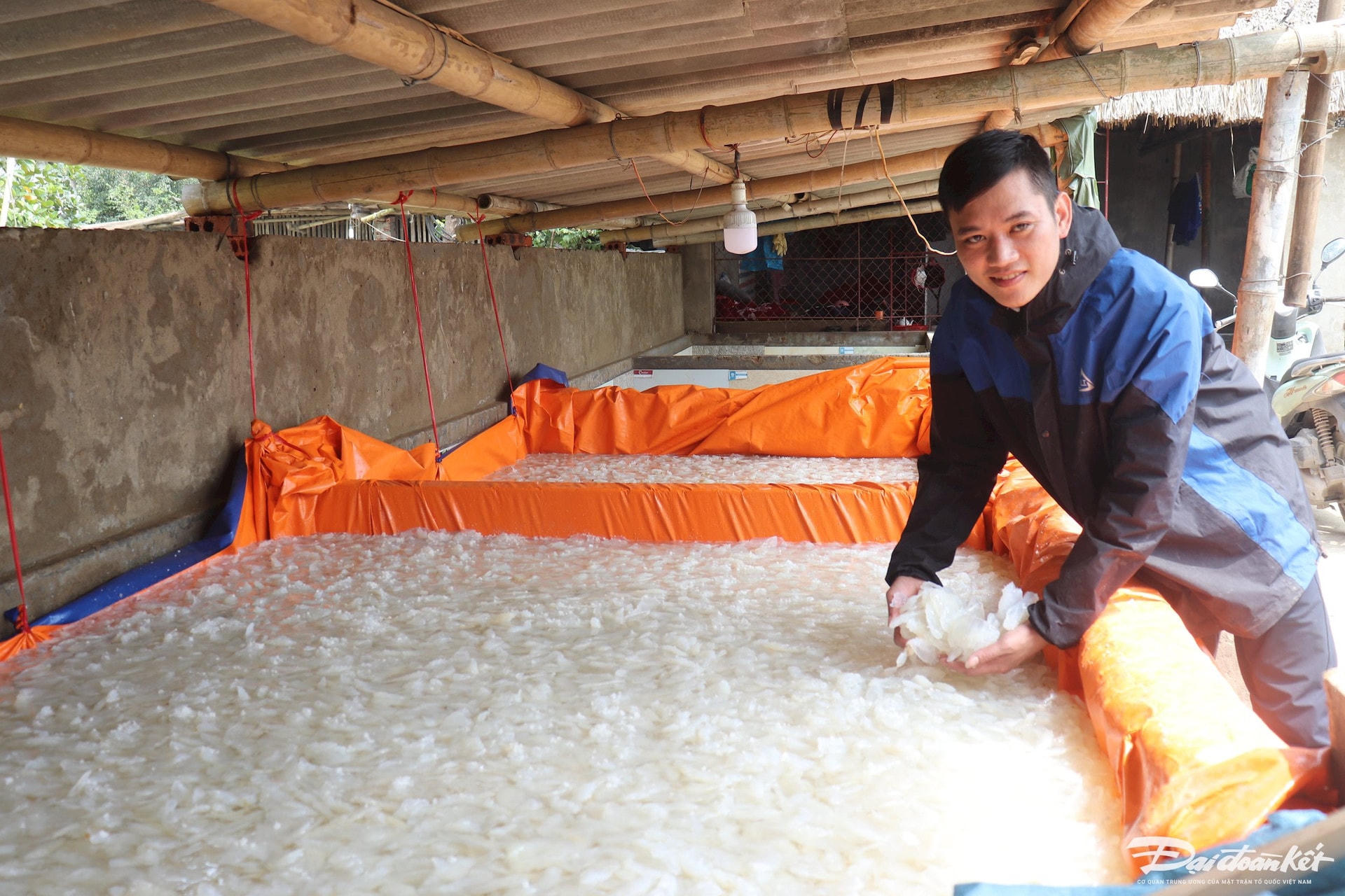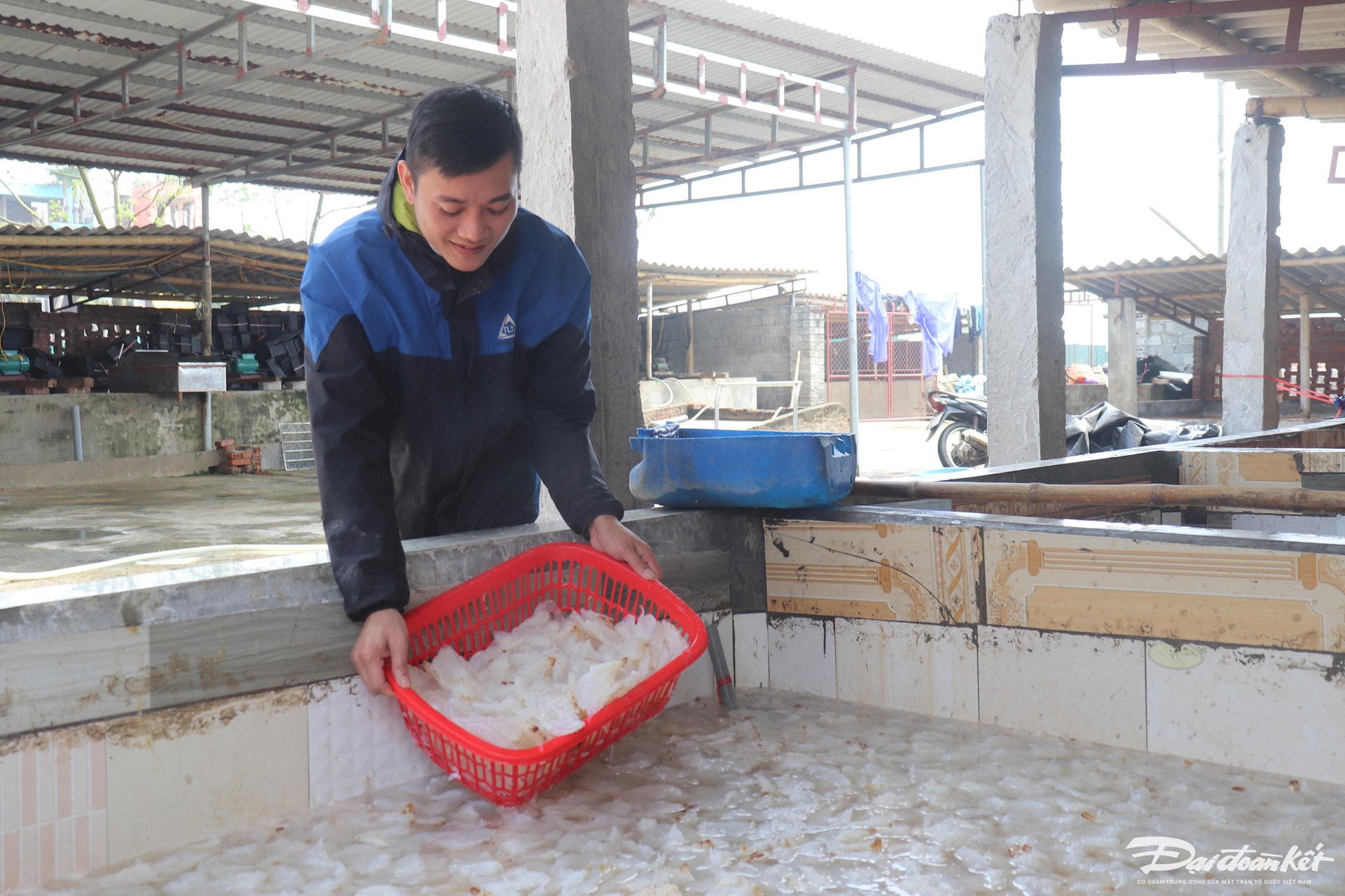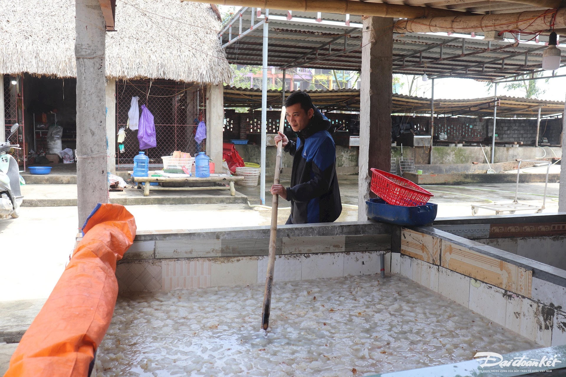 Anh Lê Phạm Thao (35 tuổi, trú xã Hoằng Trường), chủ cơ sở chế biết sứa cho biết: Trung bình mỗi ngày, xưởng của anh chế biến khoảng 1 tấn sứa (tương đương 1.000 - 1.200 con). Với giá bán hiện nay khoảng 24.000 đồng/kg sứa thân, 30.000 đồng/kg chân sứa, trừ chi phí, mỗi ngày, anh thu về 1-1,5 triệu đồng. Ảnh: Đình Minh