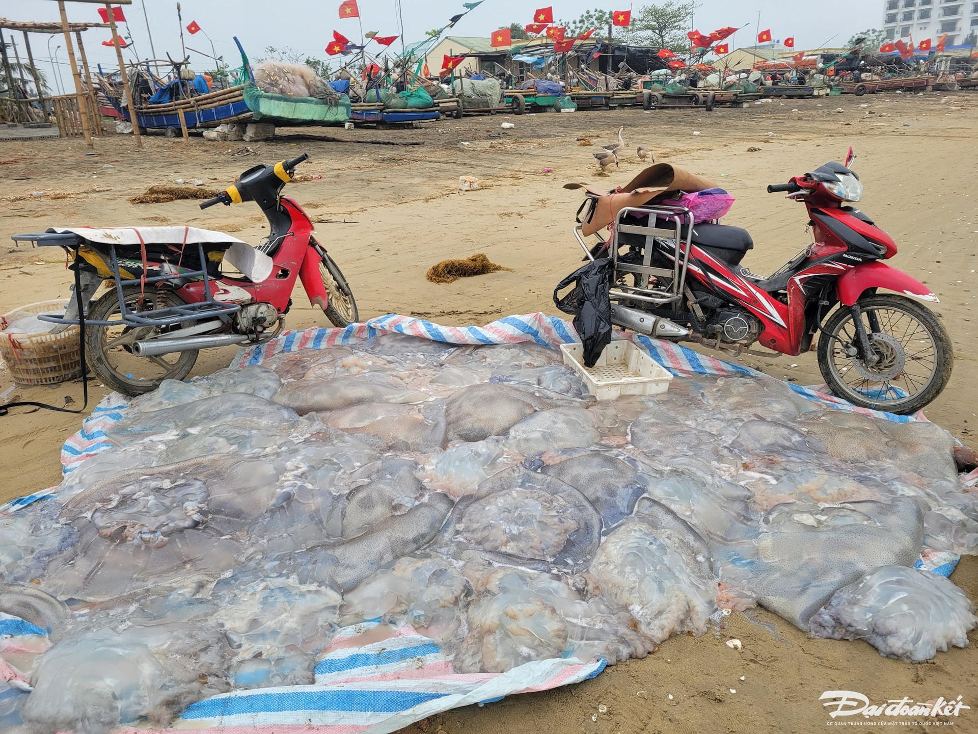 Sau khi được đưa lên bờ, các thương lái sẽ chờ sẵn để thu mua, mang đến các cơ sở sơ chế sứa. Ảnh: Đình Minh