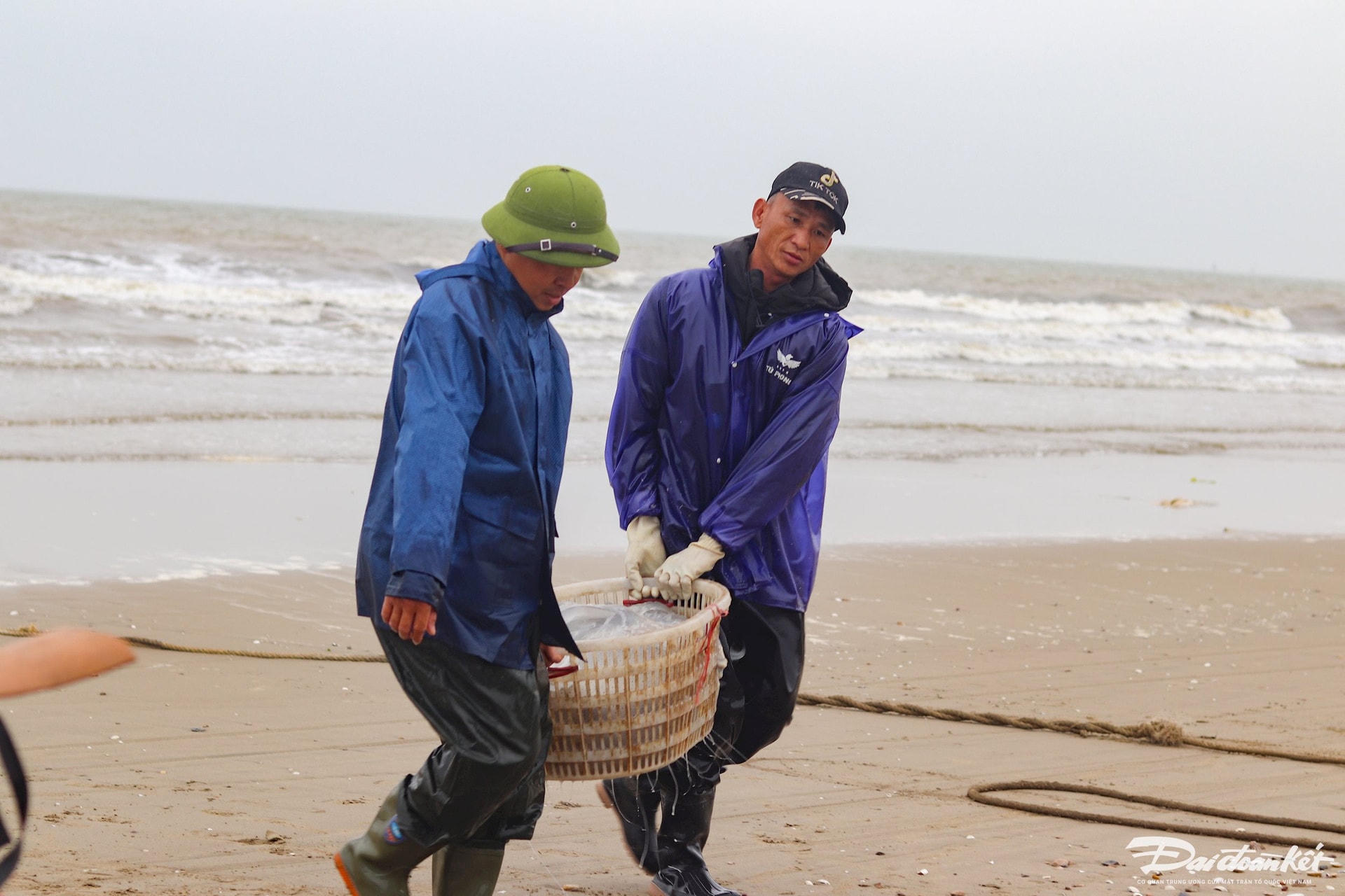 Mặc dù thời tiết bất lợi, tuy nhiên, ngư dân Hoằng Hóa, vẫn tranh thủ đi đánh mắt, mang về loại hải sản đưỡ ưu ái gọi tên là “vàng trắng.” Ảnh: Đình Minh