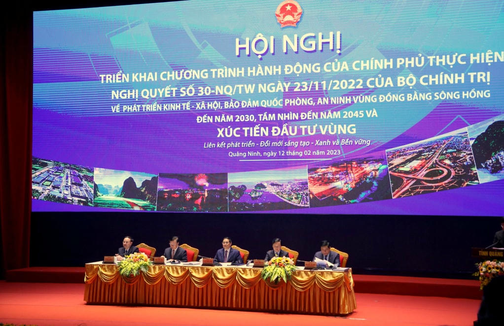 Sáng 12/2, tại TP Hạ Long (Quảng Ninh), Thủ tướng Phạm Minh Chính chủ trì Hội nghị triển khai Chương trình hành động của Chính phủ thực hiện Nghị quyết số 30-NQ/TW ngày 23/11/2022 của Bộ Chính trị về phát triển kinh tế - xã hội và bảo đảm quốc phòng, an ninh Vùng đồng bằng sông Hồng đến năm 2030, tầm nhìn đến năm 2045 và Xúc tiến đầu tư Vùng với chủ đề "Liên kết phát triển - Đổi mới sáng tạo - Xanh và Bền vững". Tham dự Hội nghị còn có gần 900 đại biểu là lãnh đạo Chính phủ và lãnh đạo các Bộ, ngành, tỉnh, thành phố trong vùng, các hiệp hội doanh nghiệp, các nhà đầu tư trong và ngoài nước.