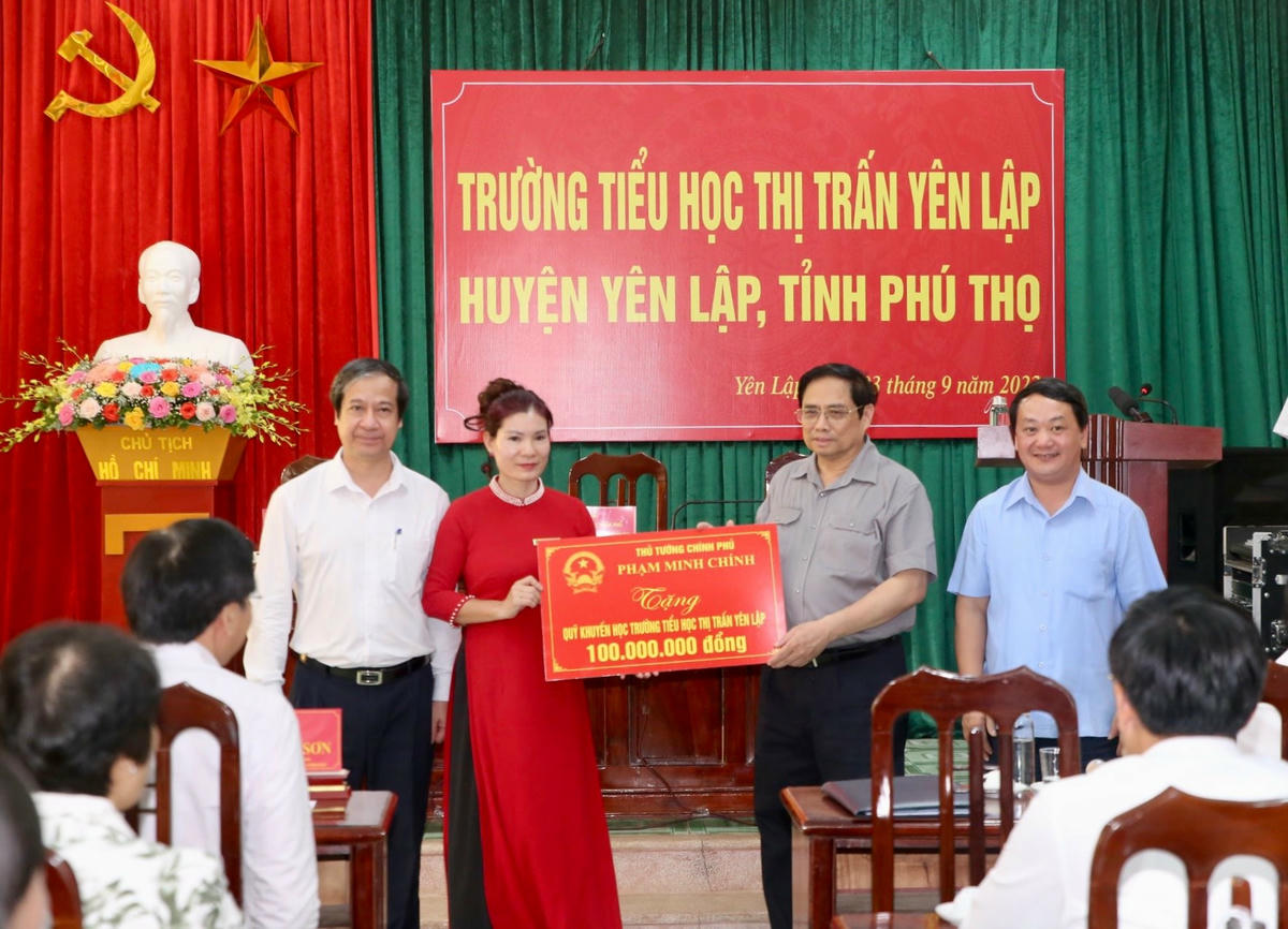 Sáng 3/9, thăm Trường THPT Yên Lập và Trường Tiểu học Yên Lập (huyện Yên Lập, tỉnh Phú Thọ), Thủ tướng ân cần hỏi thăm và gửi lời chúc tốt đẹp đến thầy cô, học sinh của trường.