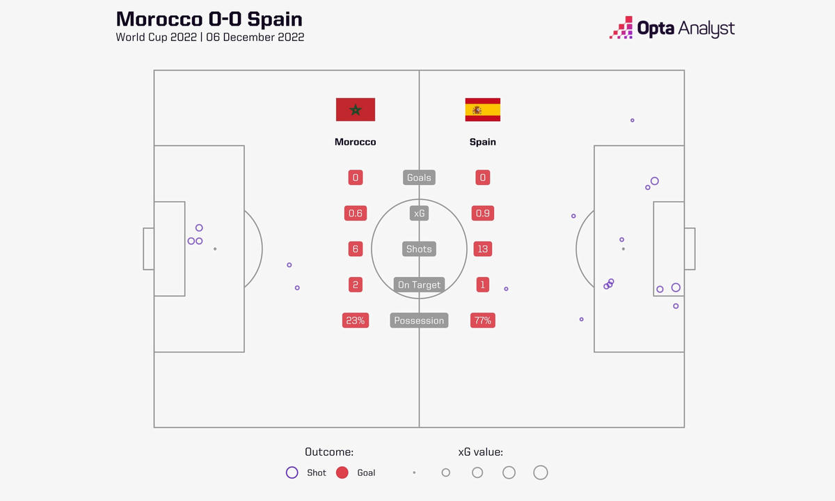 Ở trận đấu này, Tây Ban Nha cầm bóng 75%, thực hiện 800 đường chuyền, gấp gần 4 lần Morocco, nhưng chỉ có đúng 1 cú sút trúng đích sau 90 phút. Họ hoàn toàn bế tắc trước hàng thủ chơi khoa học với số đông và lăn xả, đánh chặn từ xa. Theo số liệu thống kê trong hiệp 1, La Roja chỉ tung ra 1 cú dứt điểm duy nhất, thành tích tệ nhất của họ từ năm 1966.