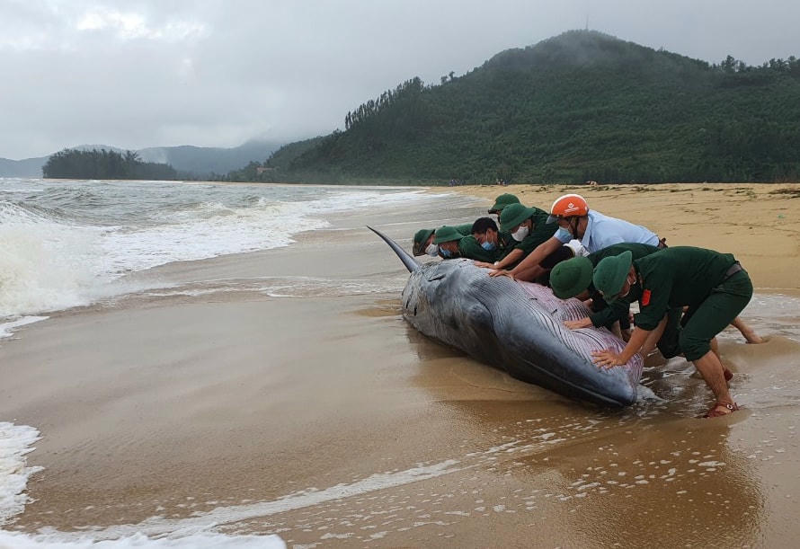 Ngay sau khi phát hiện sự việc, các cán bộ chiến sĩ Biên phòng và người dân địa phương đã nỗ lực giải cứu cá voi để đưa về với môi trường biển.