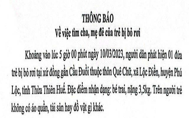 Chiều 11/3, ông Phạm Lãng, Phó Chủ tịch UBND xã Lộc Điền, huyện Phú Lộc (Thừa Thiên - Huế) cho biết, địa phương đang thông báo tìm người thân cho một bé trai bị bỏ rơi.
