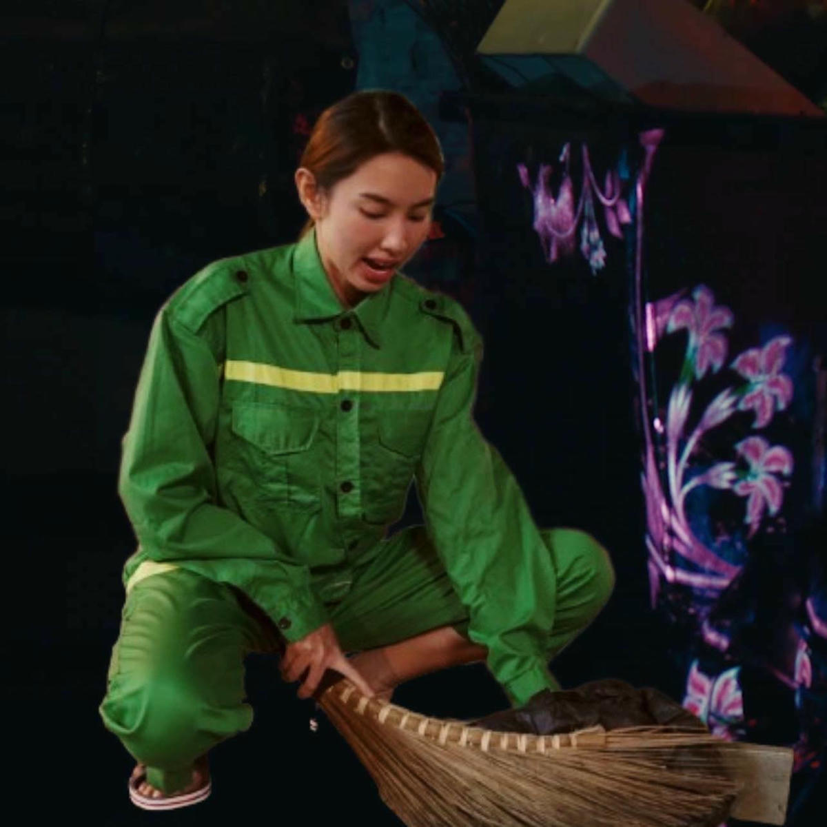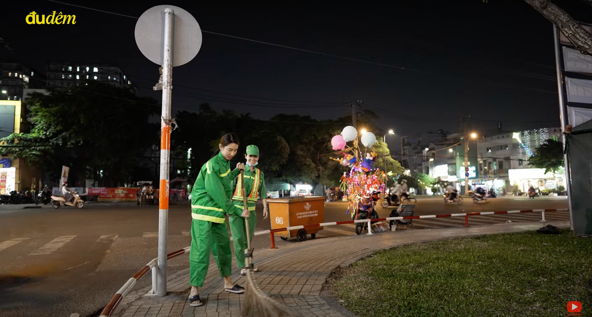 Sau drag queen (giả trai), bán mực chiên, bán bông, Hoa hậu Thùy Tiên tiếp tục trải nghiệm hóa thành lao công quét dọn buổi tối trong tập 4 của seris "Đu đêm".