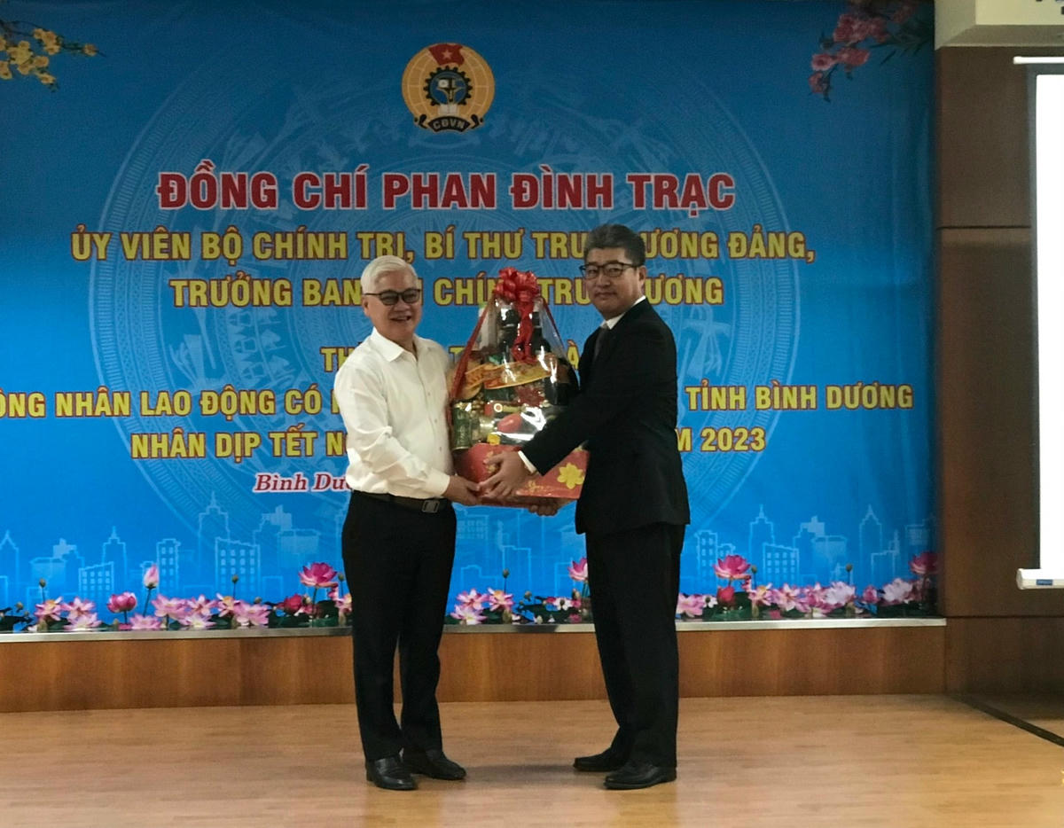 Tiếp tục chuyến công tác tại Bình Dương, sáng 16/1, ông Phan Đình Trạc, Uỷ viên Bộ Chính trị, Bí thư Trung ương Đảng, Trưởng ban Nội chính Trung ương và ông Nguyễn Hữu Dũng, Phó Chủ tịch UBTƯ MTTQ Việt Nam đã có buổi thăm, chúc Tết 2023 lãnh đạo, công nhân Công ty TNHH Yazaki EDS Việt Nam (ph. Dĩ An, Thành phố Dĩ An).