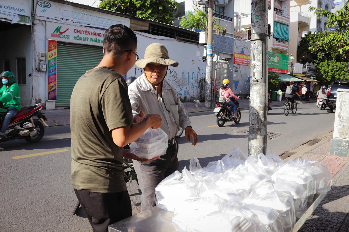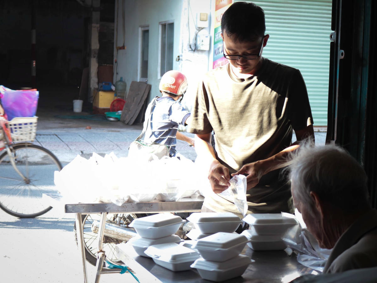 Tầm 7 giờ sáng mỗi ngày, tiệm cơm chay 0 đồng của ngoại My (TP Hồ Chí Minh) đông đúc nhộn nhịp đến lạ. Nhiều bạn trẻ tất bật chuẩn bị những phần ăn 0 đồng để gửi tặng mọi người. Chỉ một chiếc bàn inox nhỏ xếp trước nhà mà thấy thành phố này sao đong đầy yêu thương.