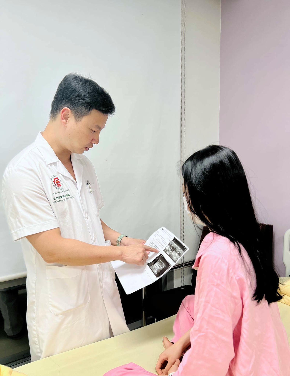 TS.BS Phạm Ngọc Minh - khoa Phẫu thuật Tạo hình và Vi phẫu, Bệnh viện Trung ương Quân đội 108 cho biết, kết quả thăm khám lâm sàng và siêu âm cho thấy ngực bệnh nhân T. có nhiều khối hỗn hợp âm bất thường trong tổ chức mô tuyến vú. Bệnh nhân được chẩn đoán viêm cấp tổ chức phần mềm vú lan tỏa.