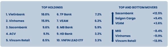 Bên cạnh đó, có thể kể tới các cổ phiếu ACB và VCB, chiếm lần lượt 12,13% và 5,83% NAV của quỹ VEIL tại thời điểm lập báo cáo.