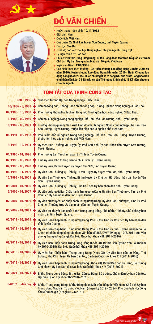 Bí thư Trung ương Đảng, Chủ tịch UBTƯ MTTQ Việt Nam, Phó Chủ tịch Hội đồng bầu cử Quốc gia Đỗ Văn Chiến là ứng cử viên đại biểu Quốc hội khóa XV thuộc đơn vị bầu cử số 4 tỉnh Nghệ An. Đại Đoàn Kết Oline trân trọng đăng tiểu sử và nội dung chương trình hành động của ứng cử viên Đỗ Văn Chiến.