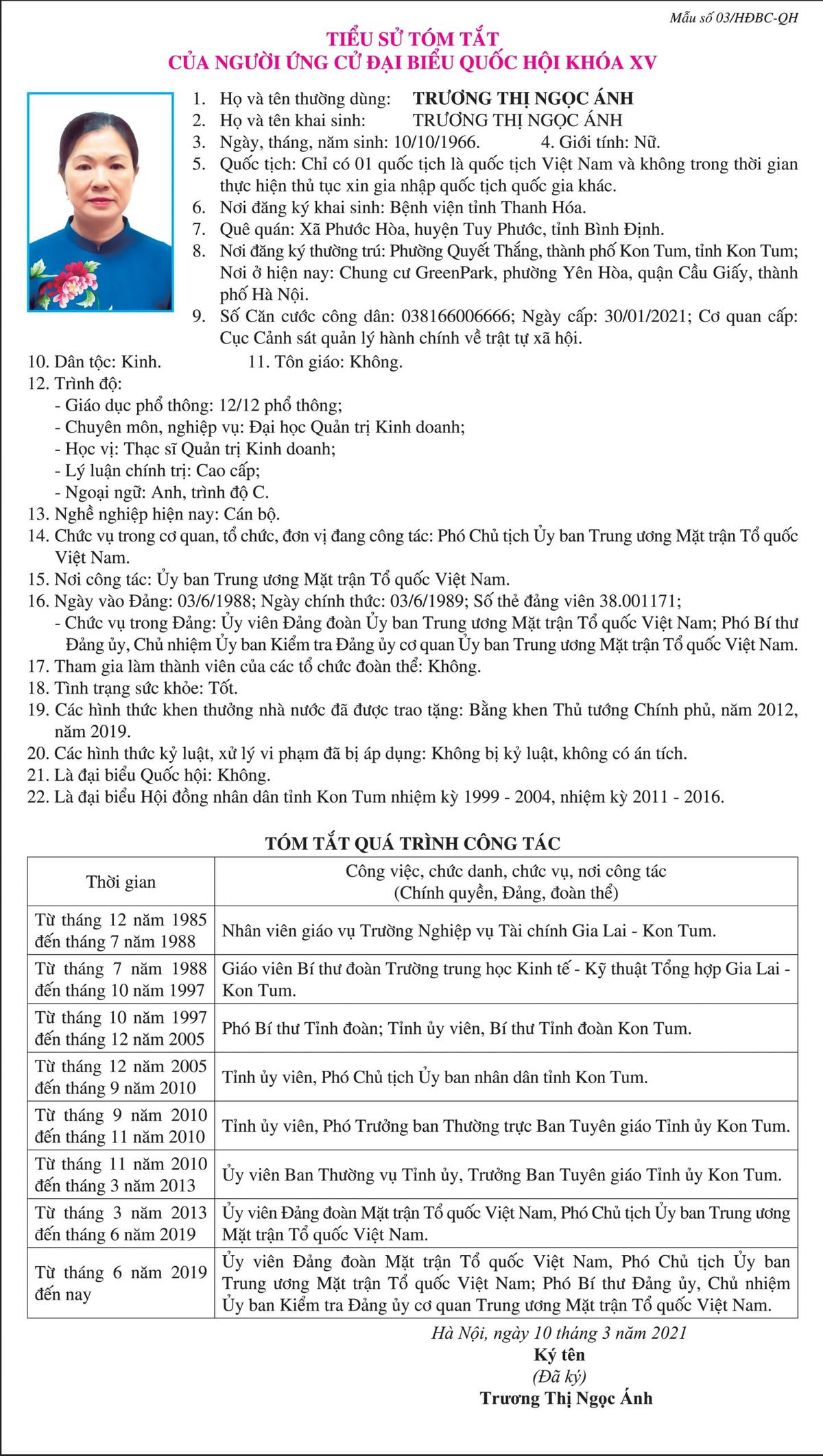 Tiểu sử của ứng cử viên đại biểu Quốc hội khóa XV Trương Thị Ngọc Ánh.