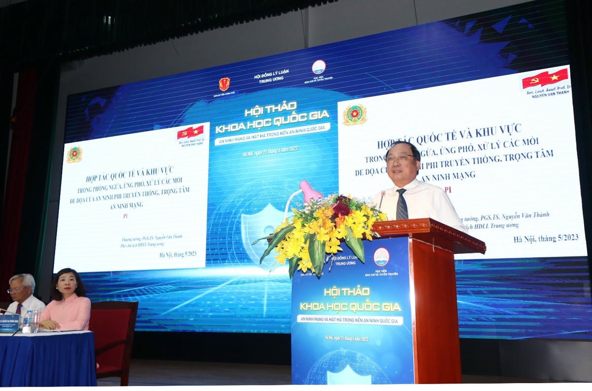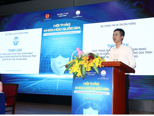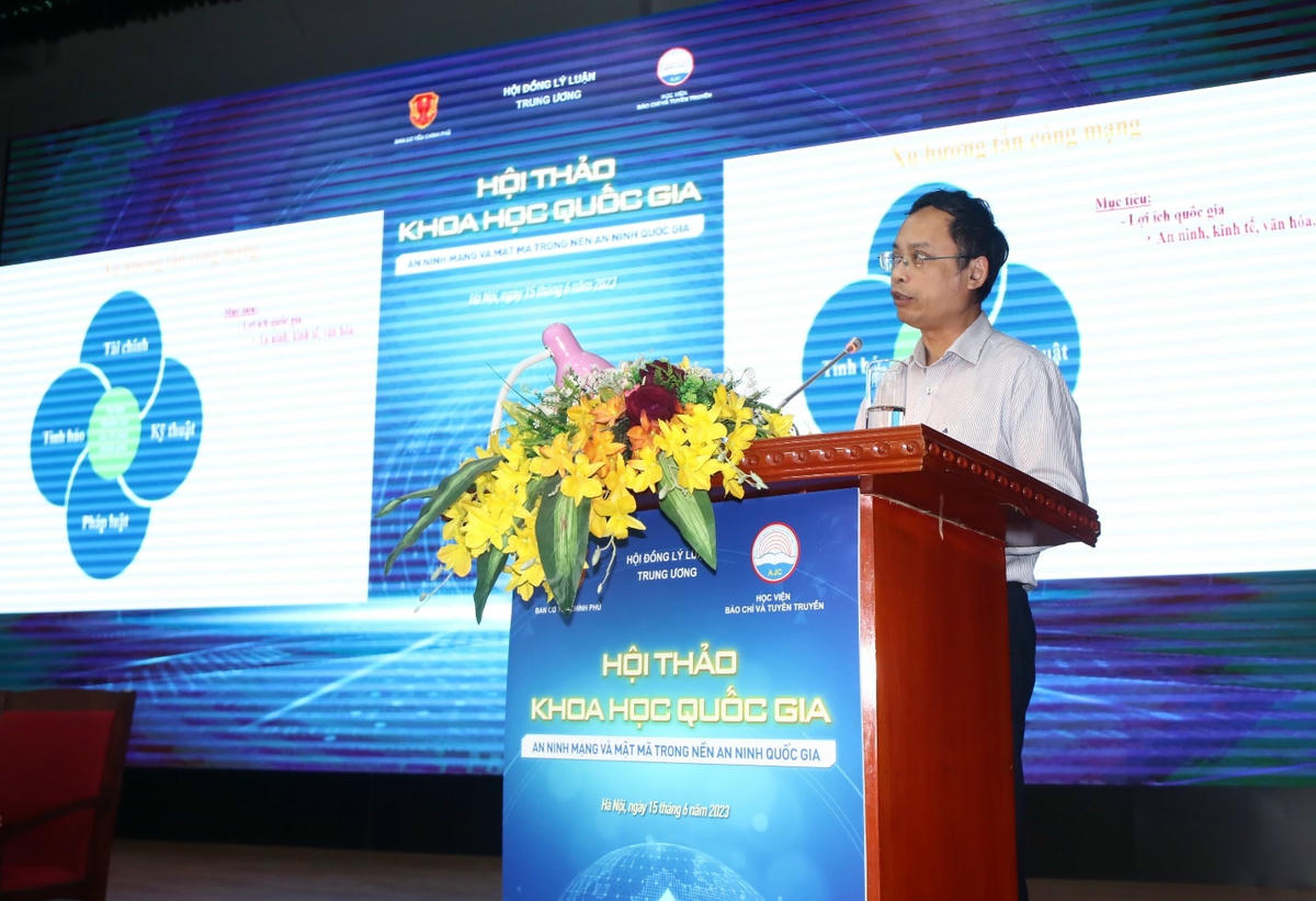 Đoàn chủ tịch điều hành Hội thảo: GS, TS. Tạ Ngọc Tấn, Nguyên Uỷ viên Trung ương Đảng, Phó Chủ tịch Thường trực Hội đồng Lý luận Trung ương; TS. Nguyễn Hữu Hùng, Phó Trưởng Ban Cơ yếu Chính phủ và PGS, TS. Nguyễn Thị Trường Giang, Phó Giám đốc Học viện Báo chí và Tuyên truyền, Chủ nhiệm Đề tài KX04-32/21-25.Hội thảo có sự tham dự của trên 300 đại biểu đến từ gần 30 cơ quan, tổ chức, doanh nghiệp và trên 50 cơ quan báo chí Trung ương, địa phương.TS. Nguyễn Hữu Hùng, Phó Trưởng ban Ban Cơ yếu Chính phủ phát biểu khai mạc Hội thảo.PGS.TS. Nguyễn Thị Trường Giang, Phó Giám đốc Học viện Báo chí và Tuyên truyền, Chủ nhiệm Đề tài KX04-32/21-25 phát biểu đề dẫn Hội thảo.PGS.TS. Lê Hải Bình, Uỷ viên dự khuyết trung ương Đảng, Phó trưởng Ban Tuyên giáo Trung ương tham luận tại Hội thảo với chủ đề: “Đảm đảm an ninh tư tưởng trên môi trường không gian mạng hiện nay”.TS. Hoàng Văn Thức, Giám đốc Học viện Kỹ thuật mật mã tham luận tại Hội thảo với chủ đề: “Mật mã trong nền an ninh quốc gia”.Thượng tướng, PGS.TS. Nguyễn Văn Thành, nguyên ủy viên BCH Trung ương Đảng, Phó Chủ tịch chuyên trách Hội đồng Lý luận Trung ương, nguyên Thứ trưởng Bộ Công An tham luận tại Hội thảo với chủ đề: “Hợp tác quốc tế và khu vực trong phòng ngừa, ứng phó, giải quyết các mối đe doạ an ninh phi truyền thống, trọng tâm là an ninh mạng”.Đại tá, PGS,TS. Nguyễn Tùng Hưng, Phó Tư lệnh BTL 86, Bộ Quốc phòng tham luận tại Hội thảo chủ đề: “Một số vấn đề đặt ra trong bảo vệ tổ quốc trên không gian mạng”.PGS.TS. Trần Quang Anh, Phó Giám đốc Học viện Công nghệ Bưu chính Viễn thông tham luận tại Hội thảo về “Xu hướng tấn công mạng và giải pháp”.Ông Trương Đức Lượng, Tổng Giám đốc Công ty Cổ phần An ninh mạng Việt Nam (VSEC) tham luận tại Hội thảo về “Đảm bảo an ninh cho Trung tâm dữ liệu”.Ông Khổng Huy Hùng, Phó Chủ tịch Hiệp hội An toàn thông tin Việt Nam, Tổng Giám đốc Công ty Cổ phần Công nghệ An ninh không gian mạng Việt Nam (VNCS) tham luận tại Hội thảo.Ông Trần Đăng Khoa, Cục Phó Cục An toàn thông tin, Bộ Thông tin và Truyền thông tham luận tại Hội thảo với chủ đề: “Thực trạng quản trị an ninh mạng ở Việt Nam hiện nay và những vấn đề đặt ra trong quá trình quản trị an ninh mạng”.GS.TS. Tạ Ngọc Tấn, nguyên Ủy viên Trung ương Đảng, Phó Chủ tịch Thường trực Hội đồng Lý luận Trung ương phát biểu kết luận Hội thảo.Các đại biểu chụp ảnh lưu niệm tại Hội thảo.