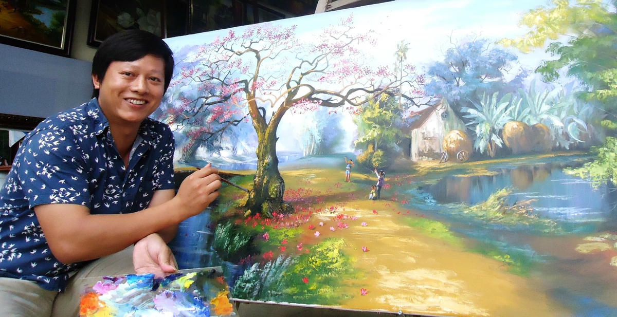 Không chọn kênh triển lãm, họa sĩ Lê Anh Thanh (quê ở Triệu Sơn, Thanh Hóa) đã vẽ hơn 50 bức tranh chủ đề quê hương, đưa lên mạng xã hội và nhận về hàng nghìn lượt yêu thích, bình luận và chia sẻ. Cùng với đó là hàng loạt những bình luận khen ngợi nét vẽ mộc mạc, bình dị về một vùng quê yên bình, trong trẻo. Thanh kể: “Cách đây hơn chục năm, tôi vào Sài Gòn lê la khắp các phòng tranh vừa làm, vừa tự học. Thời gian đầu, tôi làm cho một xưởng vẽ của họa sĩ người Pháp, tại đây bản thân lĩnh hội được rất nhiều. Sau này ông mất đi, năm 2019 tôi ra ngoài làm họa sĩ tự do, nhờ sự giúp đỡ của bạn bè, đồng nghiệp, từ đó bộ tranh “ký ức quê hương” được ra đời với hơn 50 tác phẩm chủ yếu là sơn dầu trên vải. Đó cũng là cách để tôi trở về với ký ức và nói lời cảm ơn tới quê hương mình”.