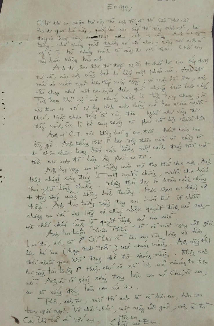 Anh về Cần Thơ mà không hỏi ý em được. Biết làm sao bây giờ. Anh không thể ở lại đây được nữa vì cũng sẽ bị chôn chân trong bốn vách tường một cách đáng tiếc mà thôi, nên anh buộc lòng phải ra đi. Anh hy vọng em sẽ thông cảm và tha thứ cho anh. Anh tin tưởng rằng tuy em buồn tủi ít nhiều nhưng em vẫn vui lòng và chấp nhận quyết định của anh - và chắc chắn cũng là quyết định của em nữa. Em từng đồng ý với anh là sẵn sàng chịu đựng cho những ý nghĩa cao đẹp, phải không em?”.