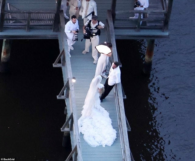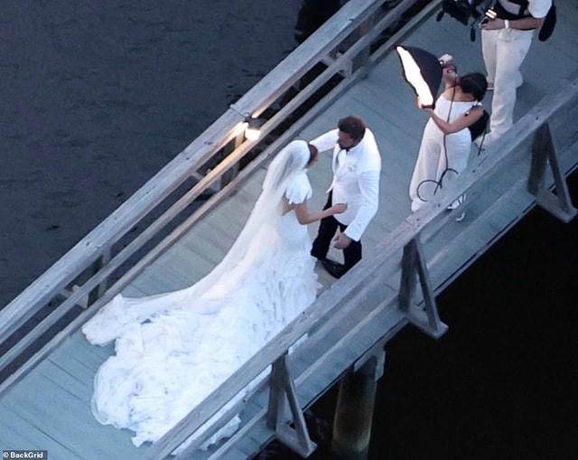 Cả hai từng được giới báo chí gọi với cái tên "Bennifer" - đã khiến những khách mời tham dự đều phải trầm trồ khi Lopez mặc một chiếc váy thời trang cao cấp màu trắng tuyệt đẹp với tà áo dài và mạng che kín mặt từ nhà mốt Ralph Lauren, trong khi Affleck trông bảnh bao trong bộ vest màu trắng và quần âu đen.