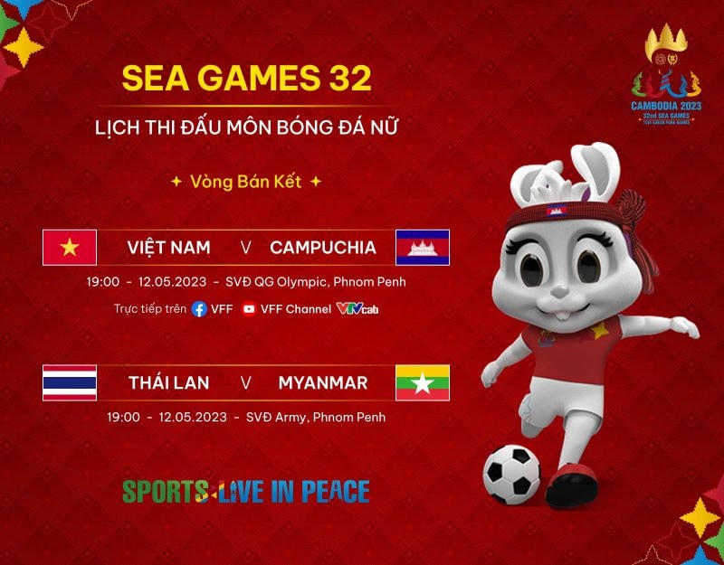 Theo lịch thi đấu, ĐT nữ Việt Nam sẽ đối đầu với chủ nhà Campuchia vào lúc 19h trong trận bán kết 1 môn bóng đá nữ. Cùng thời điểm, Thái Lan và Myanmar sẽ gặp nhau ở trận bán kết còn lại. Cuộc đọ sức giữa ĐT nữ Việt Nam và chủ nhà Campuchia sẽ diễn ra trên Sân vận động Olympic. Trong khi đó, màn so tài giữa Thái Lan và Myanmar được Ban tổ chức bố trí ở Sân vận động Quân đội.