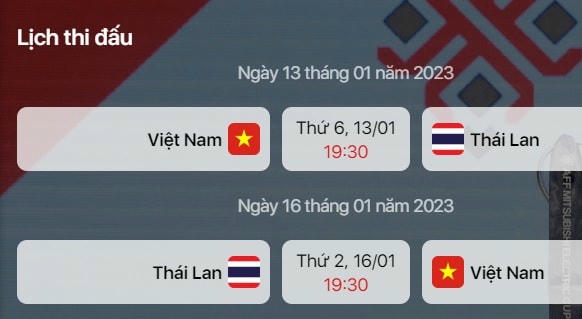 Theo lịch thi đấu chung kết AFF Cup 2022, đội tuyển Việt Nam sẽ so tài với đội tuyển Thái Lan trong hai trận lượt đi và lượt về. Trận chung kết lượt đi sẽ diễn ra vào 19h30 hôm nay (13/1) trên sân vận động Mỹ Đình.