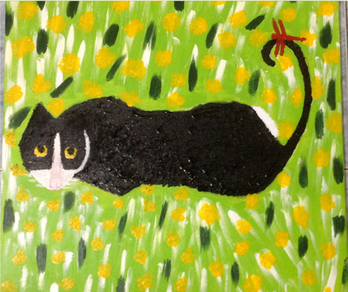 Thì tôi vẽ, lá lá hoa hoa có vẻ thuận tay. Cái thời học Tổng hợp Sinh (tức Trường Đại học Tổng hợp, khoa Sinh - B.T) khi đi thực địa chúng tôi phải vẽ tả thực một loài thực vật nào đó, lá cành rễ… Chơi với màu rất thích. Tôi có thể ngồi từ 3 đến 5 giờ để chấm chấm từng chấm màu li ti. Xong rồi đứng lên ngắm bức tranh vừa vẽ, thở dài, chẳng ra cái bộ dạng gì cả. Chán chơi với màu tôi nằm võng đung đưa đọc sách. Con mèo không nhảy lên võng đòi nằm cùng như mọi khi, nó ngồi trên chiếc ghế dài bên cạnh. Mặt nó rất buồn. hôm ấy nó bị đau bụng. Tôi nhìn nó hồi lâu rồi lấy máy điện thoại chụp lại hình ảnh của nó. Bức tranh mèo đầu tiên tôi vẽ vào tháng 8 năm 2018.