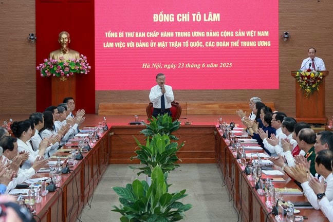 Sáng ngày 23/6, tại Hà Nội, Tổng Bí thư Tô Lâm đã đến dự làm việc và trao Quyết định của Bộ Chính trị về việc thành lập Cơ quan Ủy ban Trung ương Mặt trận Tổ quốc Việt Nam. Đây là sự kiện có ý nghĩa đặc biệt quan trọng, đánh dấu bước phát triển mới trong công tác tổ chức, kiện toàn bộ máy, nâng cao hiệu lực hoạt động của MTTQ Việt Nam theo tinh thần chỉ đạo của Ban Chấp hành Trung ương, Bộ Chính trị, Ban Bí thư và đồng chí Tổng Bí thư về xây dựng bộ máy tinh gọn, hoạt động hiệu lực, hiệu quả, phục vụ nhân