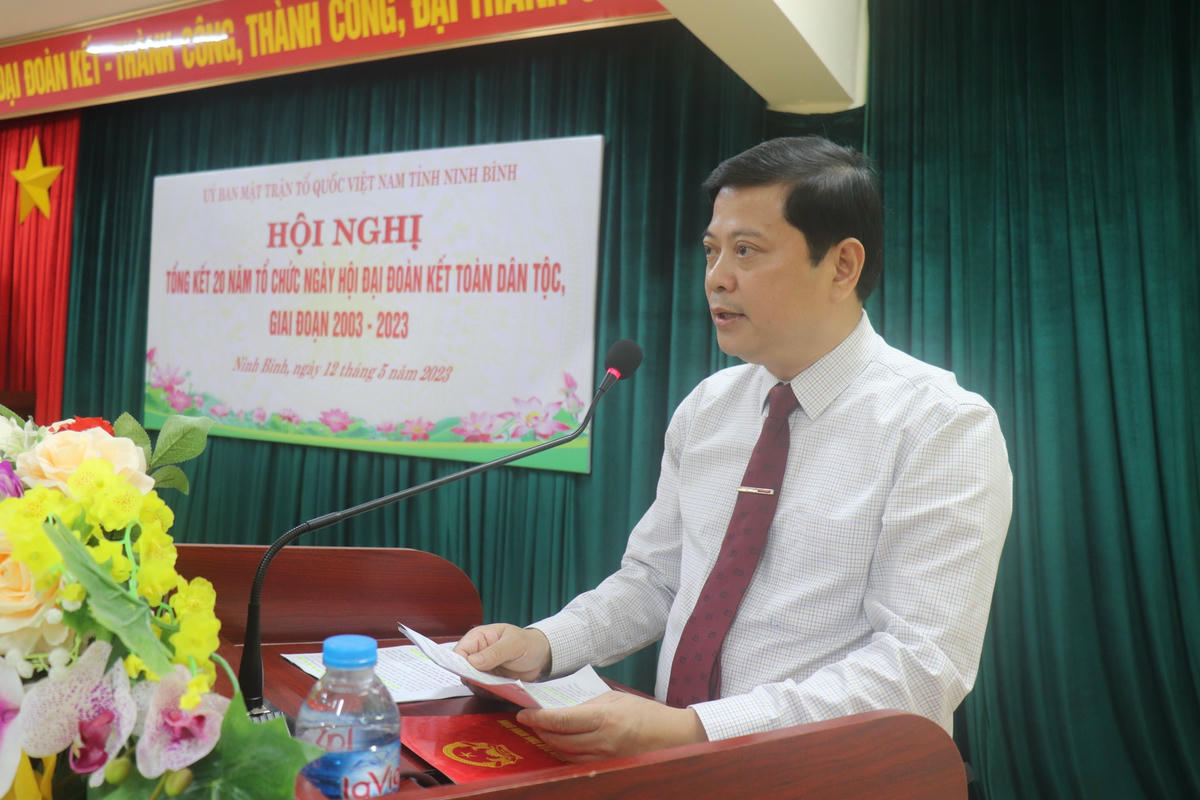 Trong phát biểu khai mạc hội nghị, ông Lê Văn Kiên, Phó Chủ tịch Ủy ban MTTQ tỉnh Ninh Bình khẳng định: Qua 20 năm tổ chức “Ngày hội Đại đoàn kết toàn dân tộc” trên địa bàn tỉnh đã đạt được những kết quả to lớn. Ngày hội đã góp phần tích cực xây dựng tổ chức Đảng, chính quyền, MTTQ VN và các đoàn thể nhân dân trong tỉnh ngày càng vững mạnh.