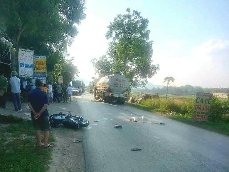 Sau cú tông mạnh với xe bồn chở xăng dầu, hai thanh, thiếu niên đi xe máy ở Thanh Hóa đã ngã xuống đường và tử vong tại chỗ.