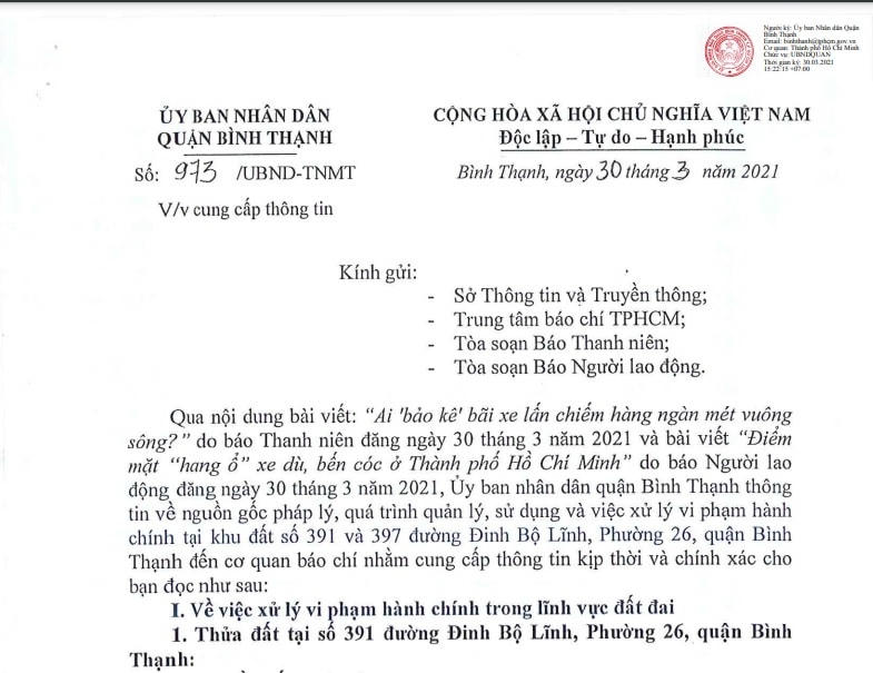 Văn bản ngày 30/3 của UBND quận Bình Thạnh, TP HCM cung cấp thông tin về nguồn gốc pháp lý, quá trình quản lý, sử dụng và việc xử lý vi phạm hành chính tại khu đất số 391 và 397 đường Đinh Bộ Lĩnh, Phường 26, quận Bình Thạnh.