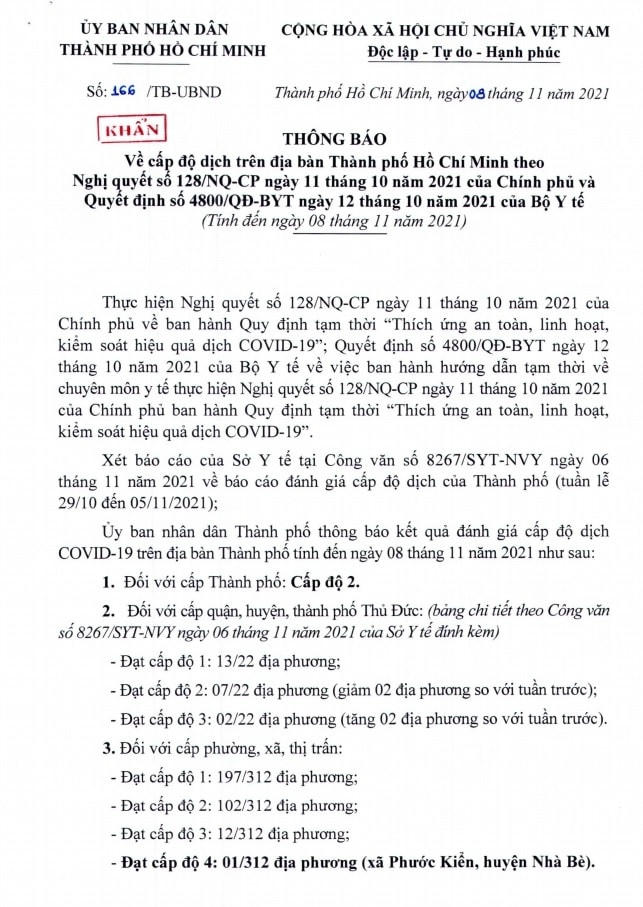 Ngày 8/11, UBND TP HCM đã ban hành văn bản khẩn (số 166/TB-UBND) về thông báo cấp độ dịch trên địa bàn thành phố theo Nghị quyết 128/NQ-CP của Chính phủ và quyết định 4800/QĐ-BYT của Bộ Y tế.