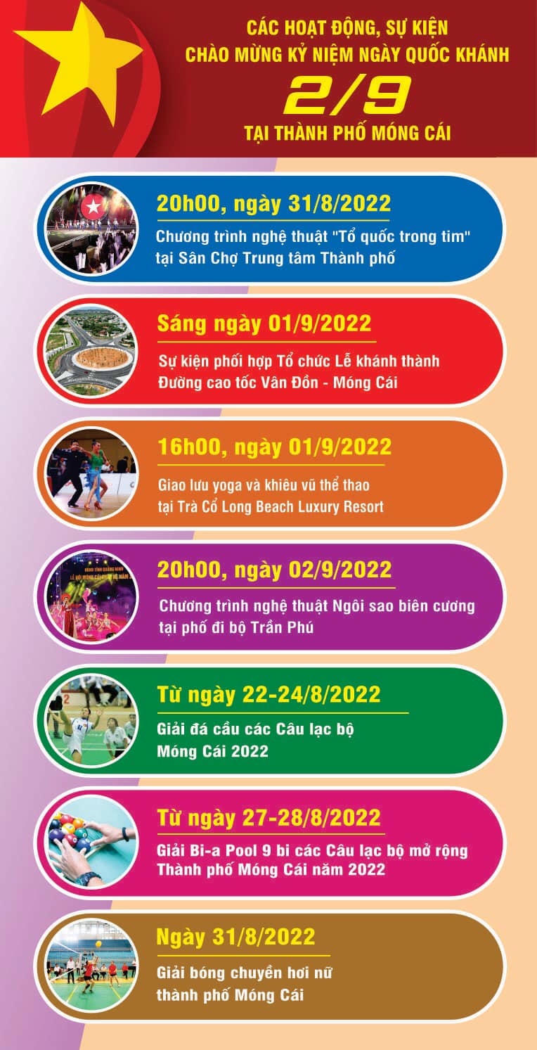 Thành phố đã lên kế hoạch tổ chức một chuỗi các hoạt động, sự kiện văn hóa - thể thao nhằm chào mừng Kỷ niệm Ngày Quốc khánh và kích cầu, thu hút khách du lịch. Đặc biệt, ngày 1/9, tuyến đường cao tốc Vân Đồn - Móng Cái sẽ được khánh thành và chính thức đưa vào khai thác. Vì vậy, lượng khách đổ về Móng Cái trong dịp nghỉ Lễ 2/9 sẽ tăng rất cao. Dự kiến, Thành phố sẽ đón gần 150.000 lượt khách du lịch trong 4 ngày nghỉ dịp Lễ 2/9.